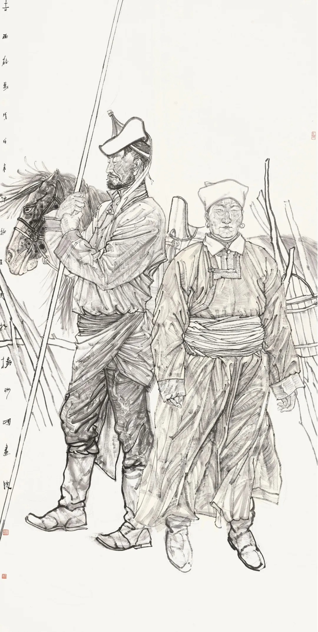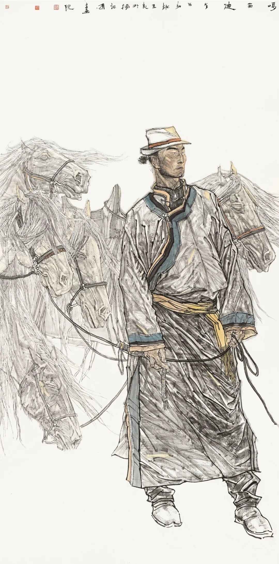 美的最高境界是崇高,是带有悲剧性的庄严,蒙古民族的传奇历史,恰好把这两种美融化在血脉之中,我则紧紧抓住蒙古人的主题,反反复复地形诸笔墨,终于使作品不仅有文人雅赏的轻松情调,更有了扑面而来撼人心魄的力量。