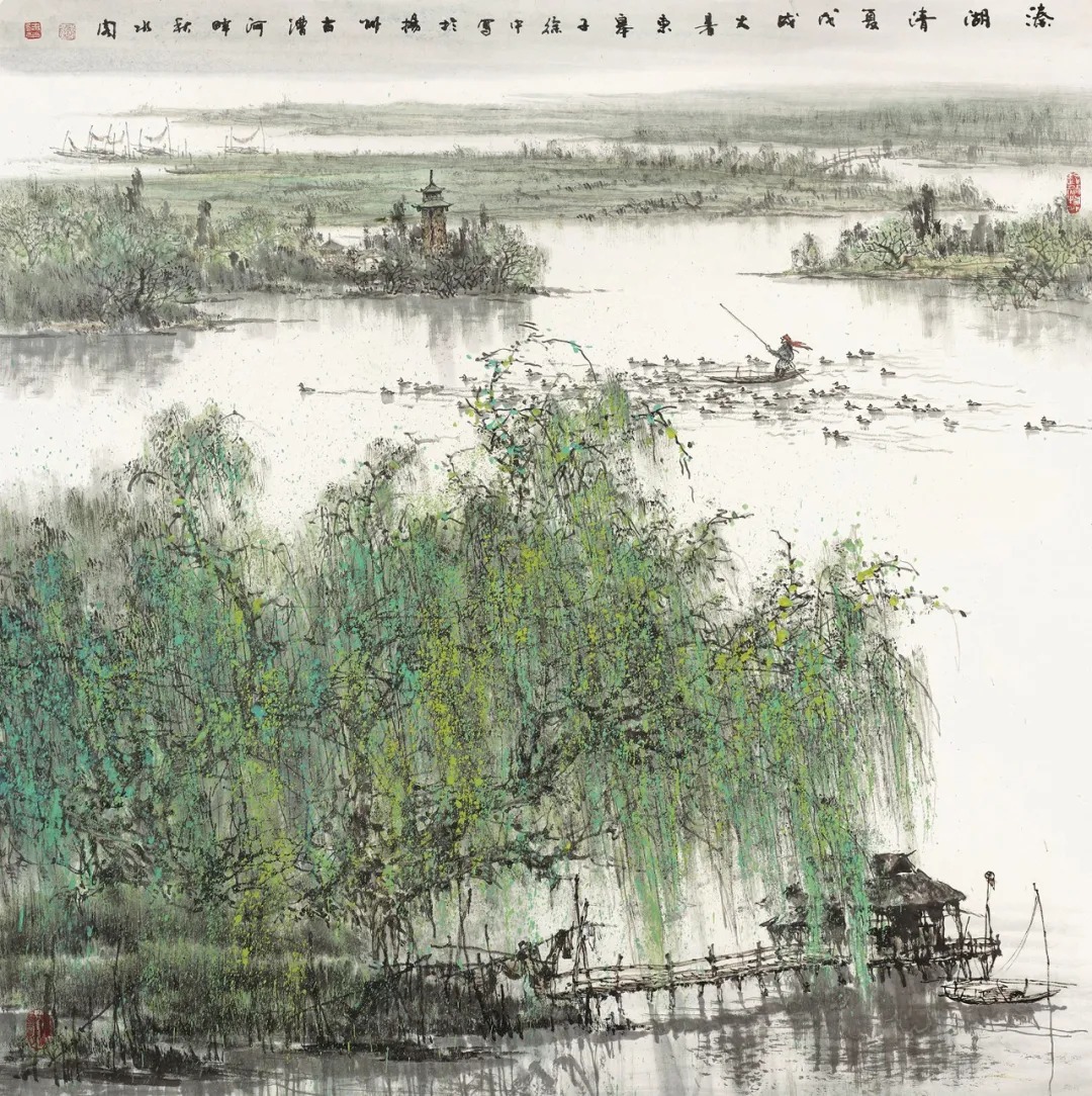 此件作品为溱湖采风后所作。恰值清夏,满目皆绿;水上牧鸭,恬然自安。