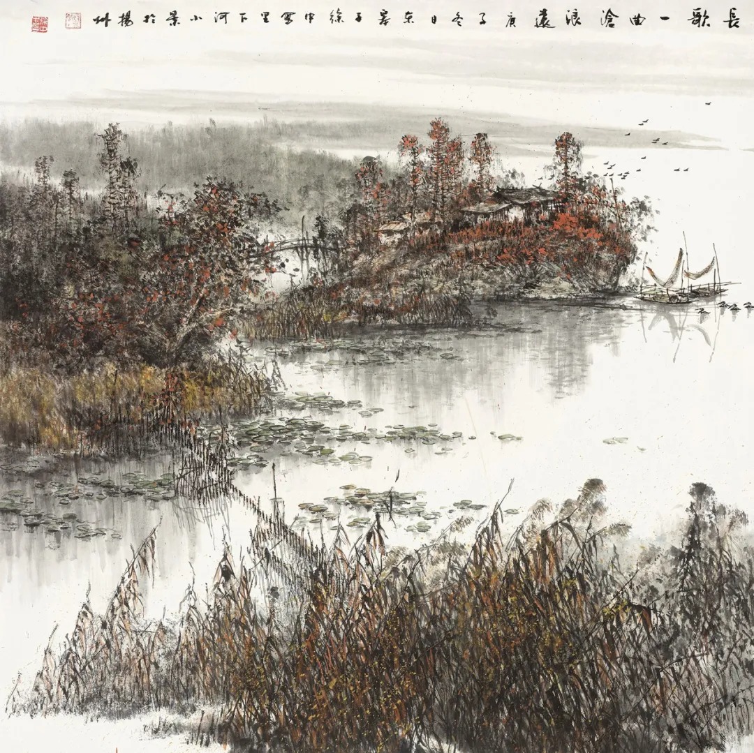 扬州因水而兴、缘水而美,里下河地区水网密布,别具特色。此件作品表现的是里下河地区深秋景色,但山河有色,并无萧索之意。虽未画一人,水乡人家的生活气息扑面而来。
