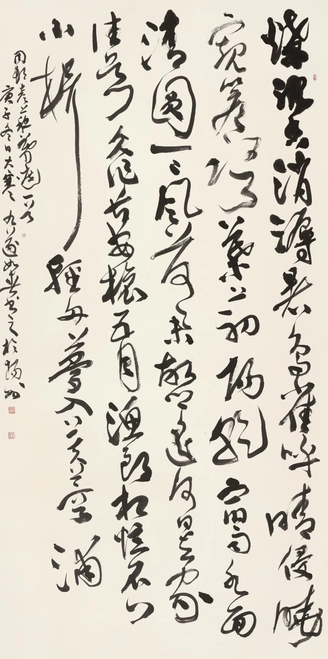 周邦彦是“负一代词名”的大词家,是词之集大成者,《苏幕遮·燎沉香,消溽暑》是其代表作,清新自然,健康爽朗,风致绝佳,颇现词人襟怀。以大幅草书书写,欢快热烈,恰与春和景明之新时代合拍。
