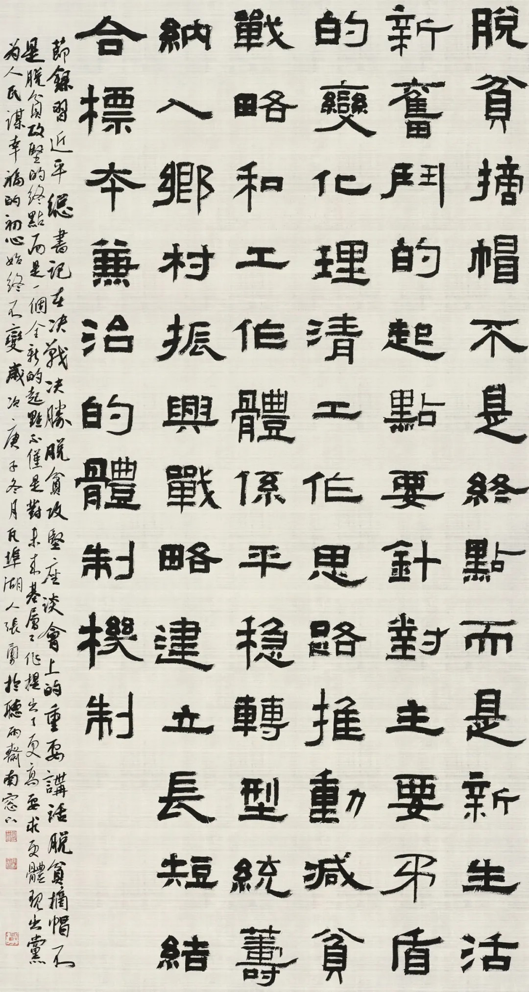 2020 年是全面建成小康社会收官之年,也是脱贫攻坚决战决胜之年。我本人也有幸参与到脱贫工作去中,到农村送温暖、送文化。接到创作通知后,我选择的内容是习近平总书记在脱贫攻坚决战决胜座谈会上的讲话内容。我正文用端庄厚重的隶书书体,款字用三行小行书,增加整幅作品的协调性和统一感。