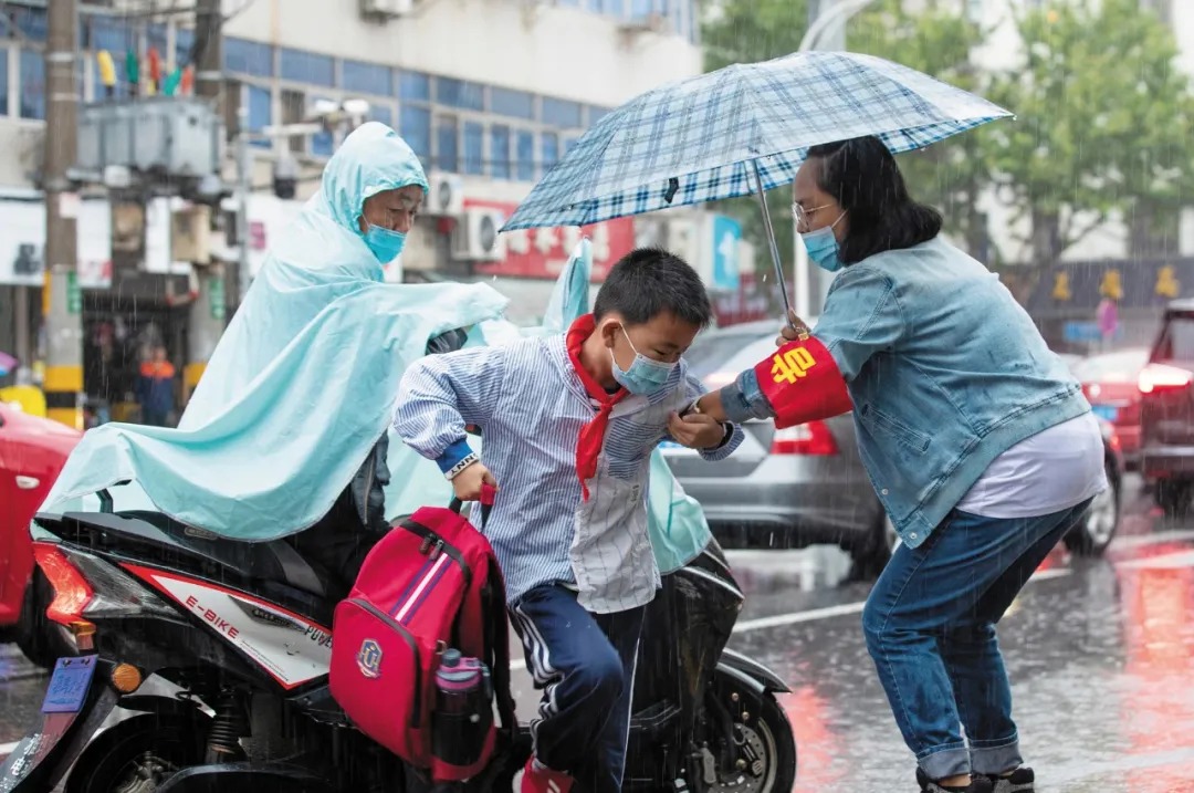 风雨中值勤的老师,在学校门前护卫上学的学生。我用相机定格住老师从家长手中接过孩子的瞬间,这既是爱的传递,更象征着广大青少年在家庭、学校以及整个社会的关心呵护下,健康成长。
