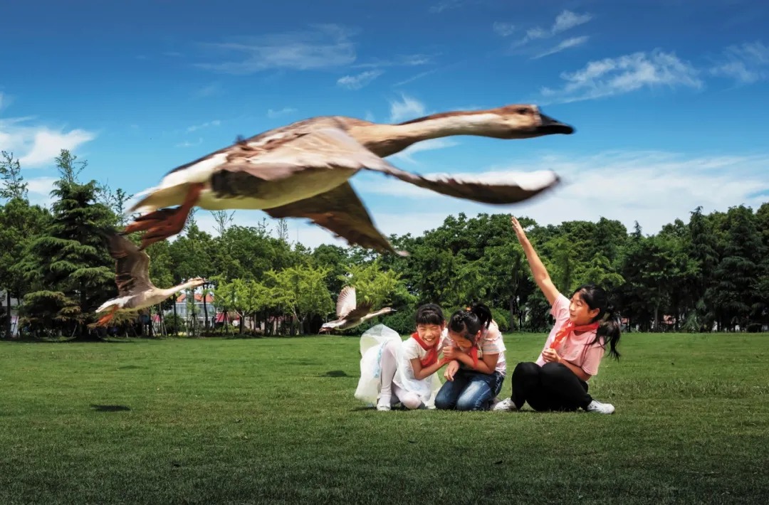 一群放飞的大雁超低空掠过草地上正在玩耍的小学生,孩子们惊吓与喜悦的心境立刻显现出来。为了夸张这一视觉效果,采取俯卧方式拍摄,在注视着大雁飞来的同时竭力定格孩子们的瞬间情绪。