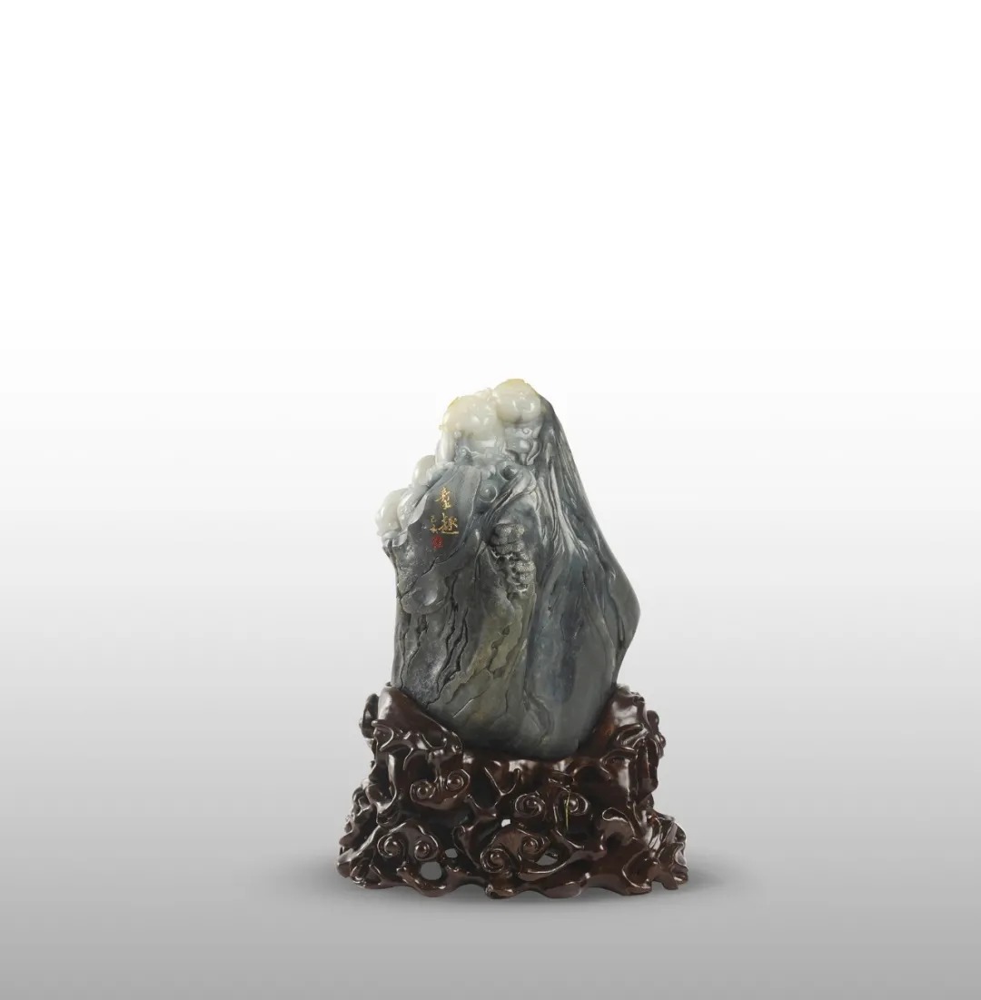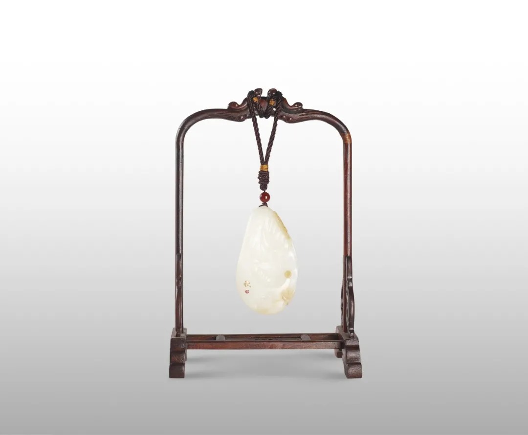 这件作品以青花和田玉为原料,根据其色泽,巧妙地把“俏色”运用好,上端白色做成童子,下端黑色做成老树根,并且和扬州的山籽雕有机地结合起来。