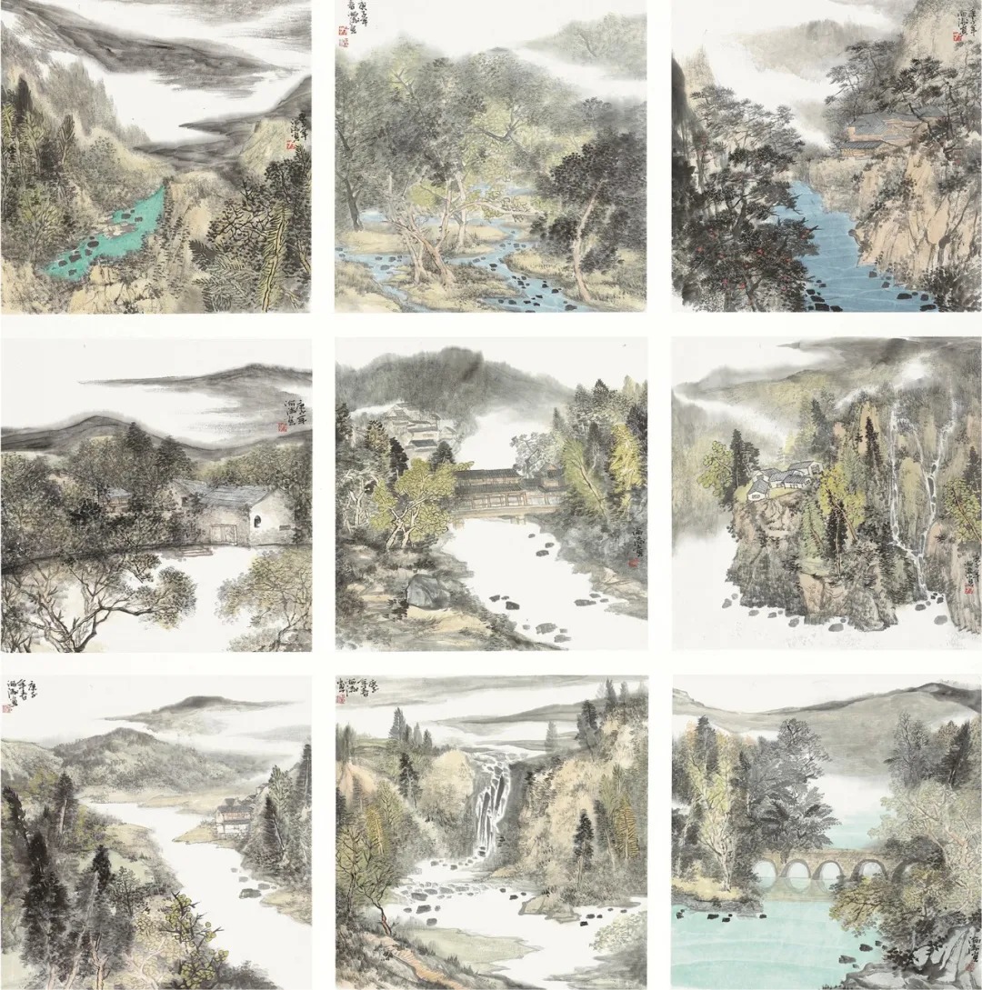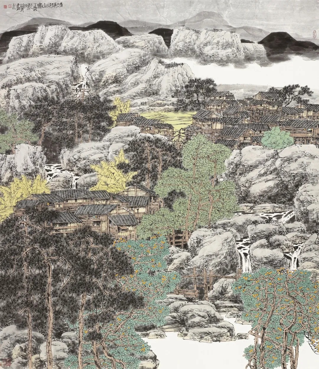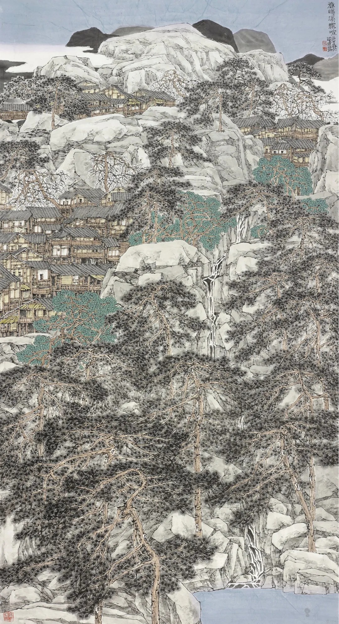 黔山自然山水别具一格,有南北山脉兼容之貌,植被丰茂,溪水淙淙,山里木结构苗寨错落有致,这是我近期山水画创作获取灵感的来源。《春暖溪寨喧》创作于庚子春日,创作中以细笔勾勒松壑、苗寨、溪水等,并加以渲染,设色典雅,营造出一种生动活泼、充满朝气的祥和之气,呈现一种我心中的理想画境。