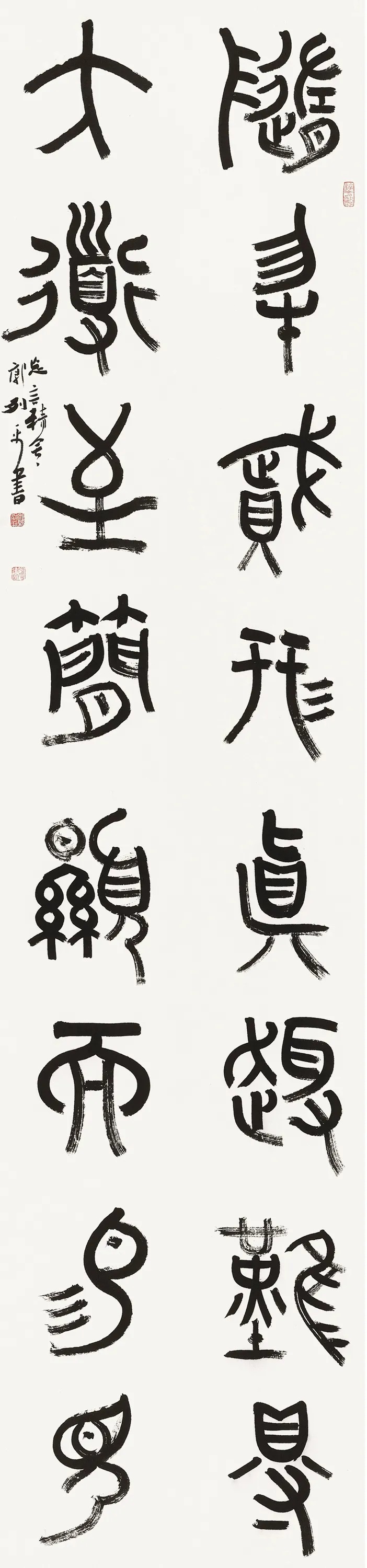 “随物赋形真趣难得,大道至简显而易见”,以大篆书此联,展现书法艺术缤纷多彩的意趣和烂漫多姿的魅力。创作中随字赋形,力求质朴、开阔,雅致、端庄,展示书法艺术空灵、简淡、萧散的境界。