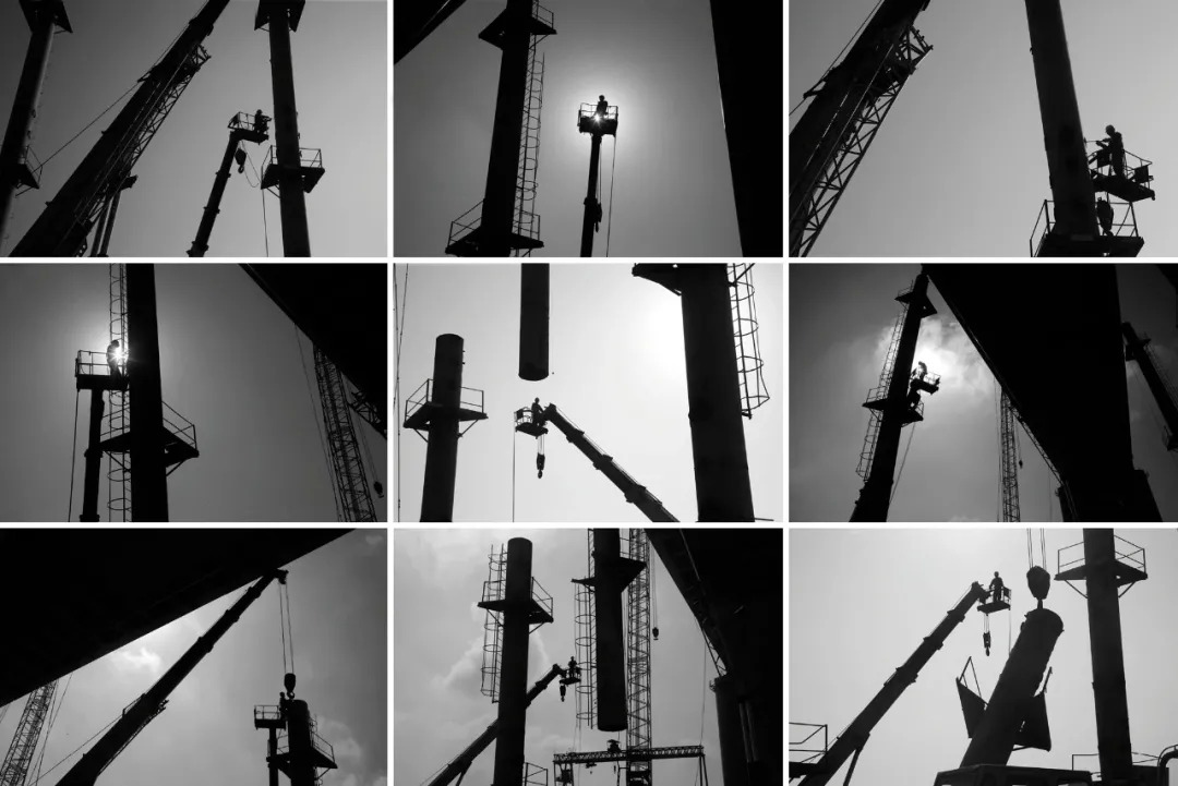 这离不开伟大建设者的辛勤劳动。这是一组通过逆光摄影剪影手法,抓拍于盐城新洋港特大桥建设中,工人师傅吊装钢管的组合镜头。