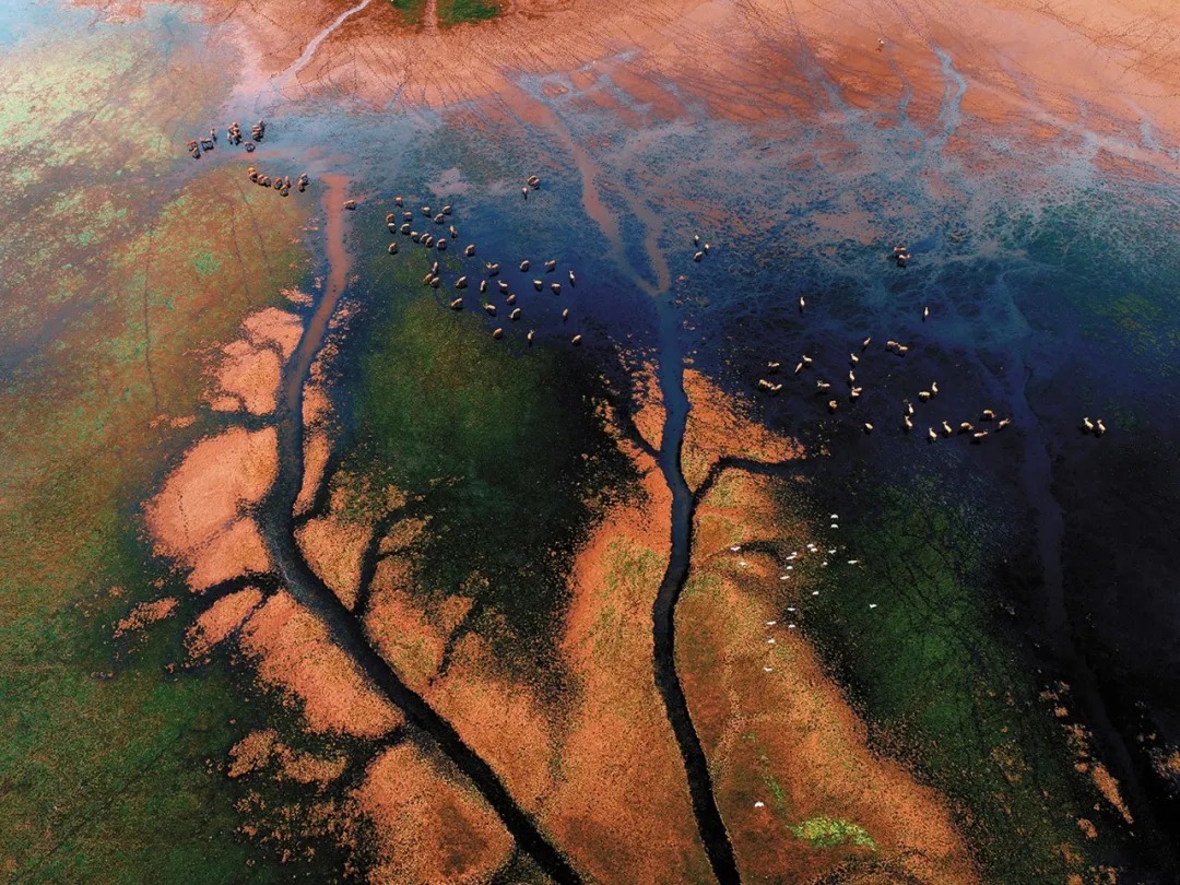 黄海湿地,地球之肾。这里是世界自然遗产地。红蒿尽染,光影离陆,港汊酷似树林。有无数精灵跳跃其间,往事越千年,如今麋鹿新生。
