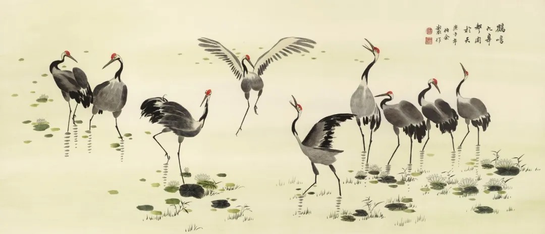 《鹤鸣九皋 声闻于天》发绣艺术挂屏系发绣墨绣原创作品。绘画构思受南唐徐熙“野逸画风”影响,赋予花鸟画承载其艺术境界:“有永兴人之意者,率能奇造化而移精神,遐登临览物之得也。”作者居住地为江苏盐城地区,乃丹顶鹤故乡。绘写丹顶鹤动态之美为作者心宜之作。设计将丹顶挑色引人注目,全画没骨写意,运笔纤细而遒劲,纵放而又有法度,白鹤晾翅,稳捷而又不失沉稳,形神备俱,相得益彰。绣制此幅作品首先考虑精选自然色发,虽是单面绣作品,但采用双面绣的技艺,并且灵活掌握水墨色阶的多种色发自然过渡,力图表达写意画中淡淡相宜的水墨色质的协调和谐。在绣丹顶鹤鹤冠时,注意突兀的立体形状,运用小点针、以求逼真效果。注意比较众鹤写意动态的差异,以求其没骨写意的神韵。