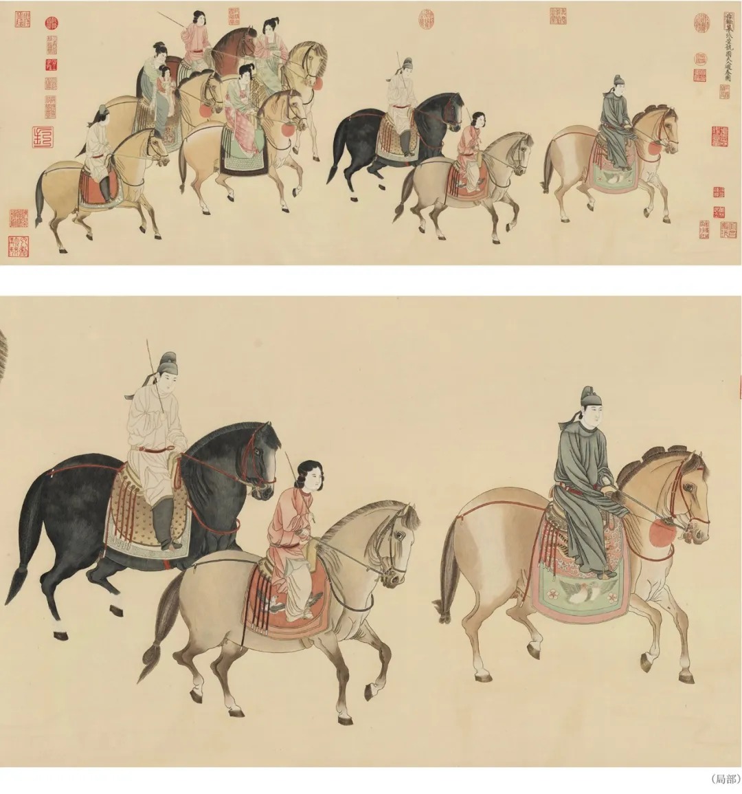 《虢国夫人游春图》为唐·张萱所绘,绢本,设色。今所存世为宋摹本,藏辽宁博物馆。张萱与周昉同为绘画仕女题材的画家,张萱笔下的仕女突破汉魏时代说教功能,着意表现妇女在日常生活情境下的状态,此幅图画描绘天宝年间唐玄宗宠爱的楊玉环贵妃的三姊虢国夫人及其眷属盛装出游的情境,再现盛唐时期繁华景象。设计绣制这幅历史名画发绣,旨在让人们借助盛唐时期妇女服饰仪容描绘,帮助人们理解唐代妇女如何思想解放,敢于大胆吸收外来装扮的风貌。