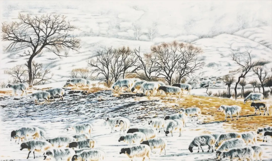 《草原雪霁》是一幅展现深秋初冬的第一场雪的草原风光的作品,它将白瓷的纯洁肌理、绘画的唯美意境,以及雕刻的精细之美表现得淋漓精致。凌乱但错落有致的枯草,苍茫孤寂的树林,一片未被大雪完全覆盖的黑土,以及一群刨雪觅食的绵羊。以白瓷晶莹、剔透的肌理来充分展现雪景的美妙质感,让瓷与画水乳交融。