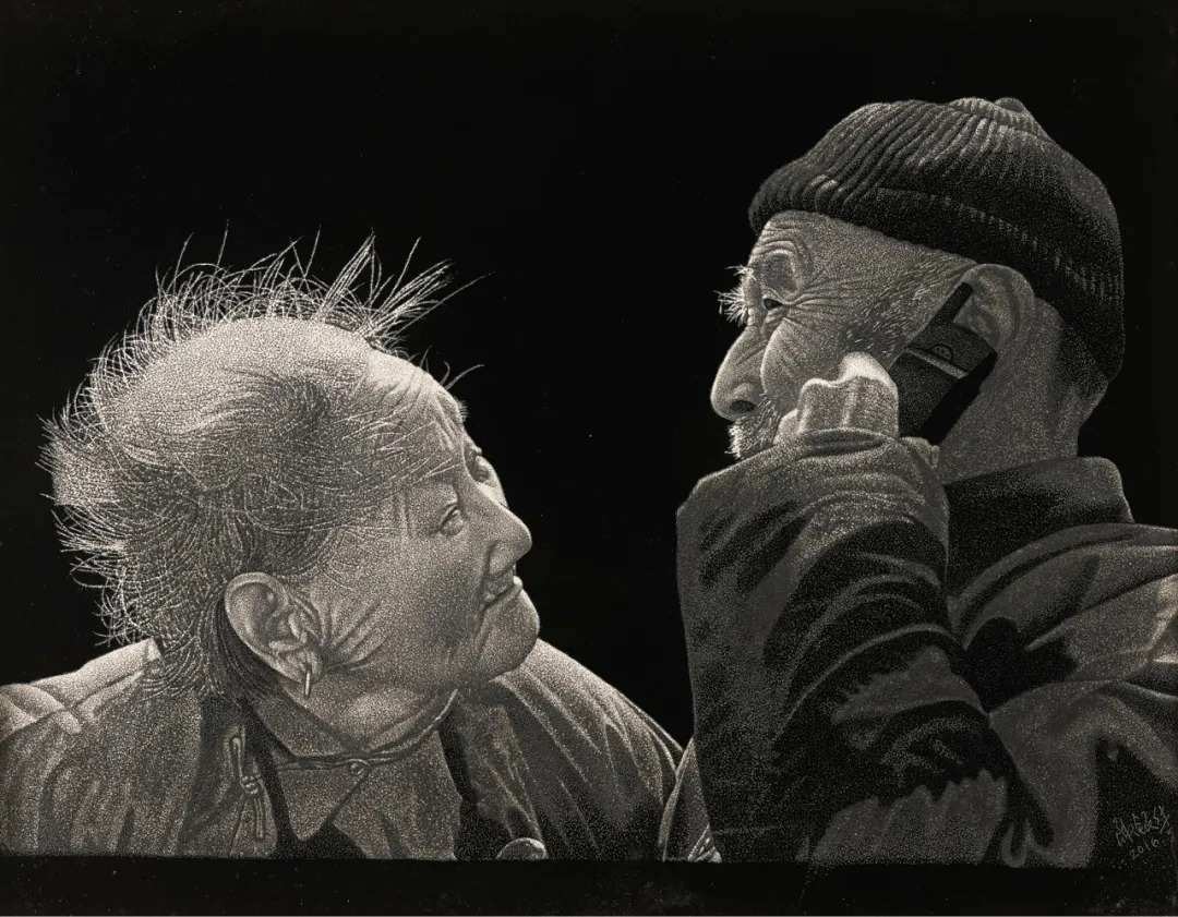 作品中的两位老者满脸皱纹、满头银发,是岁月的印痕和洗礼,黝黑的父亲接着子女打来的电话,满面荣光,老母亲侧耳倾听,神情充满期待,整个画面温暖而感动。一通电话是唠叨、是问候、是倾诉、是关切,蕴含了父母与子女之间的惦念与爱。