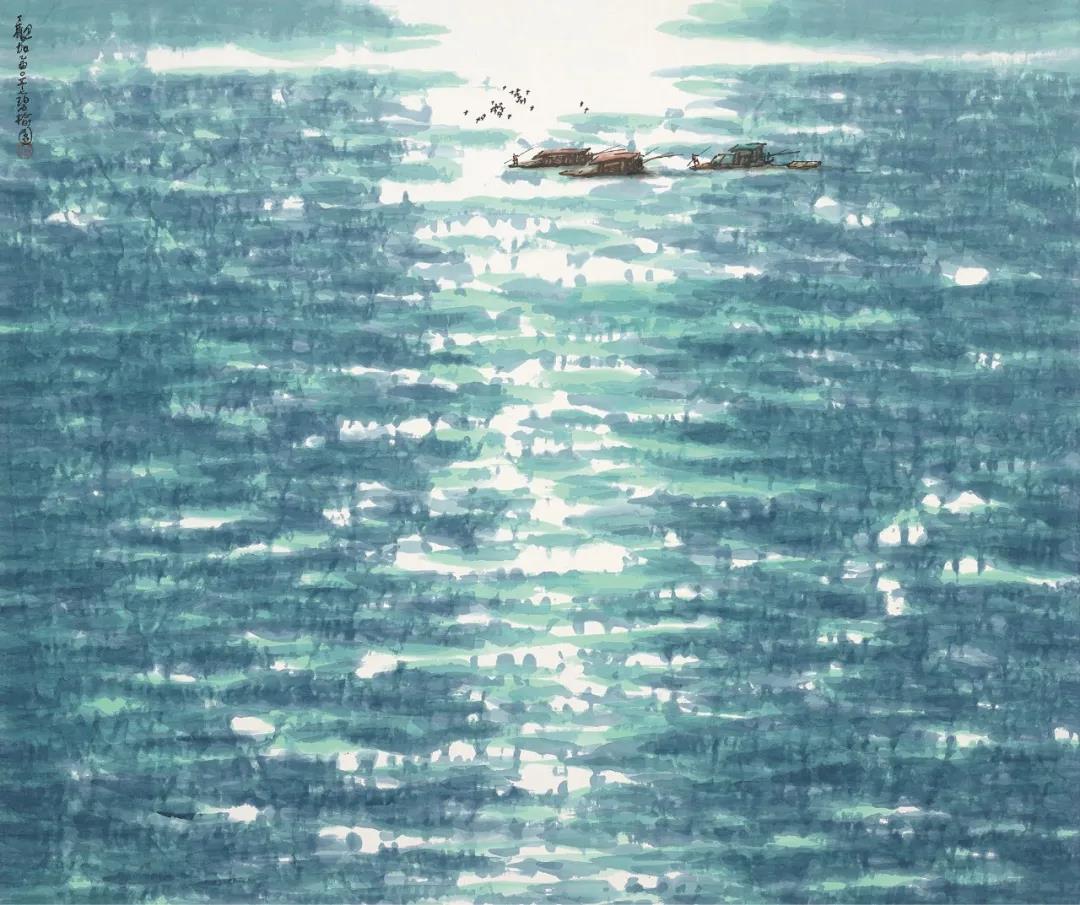 水,是我创作的题材之一。水,作为系列作品,我把它描绘成早晨与傍晚,晴日与月下以及阴晴雨雪,还有春、夏、秋、冬四季图,这幅《渔歌》描绘的是朝阳下波光粼粼的景色。