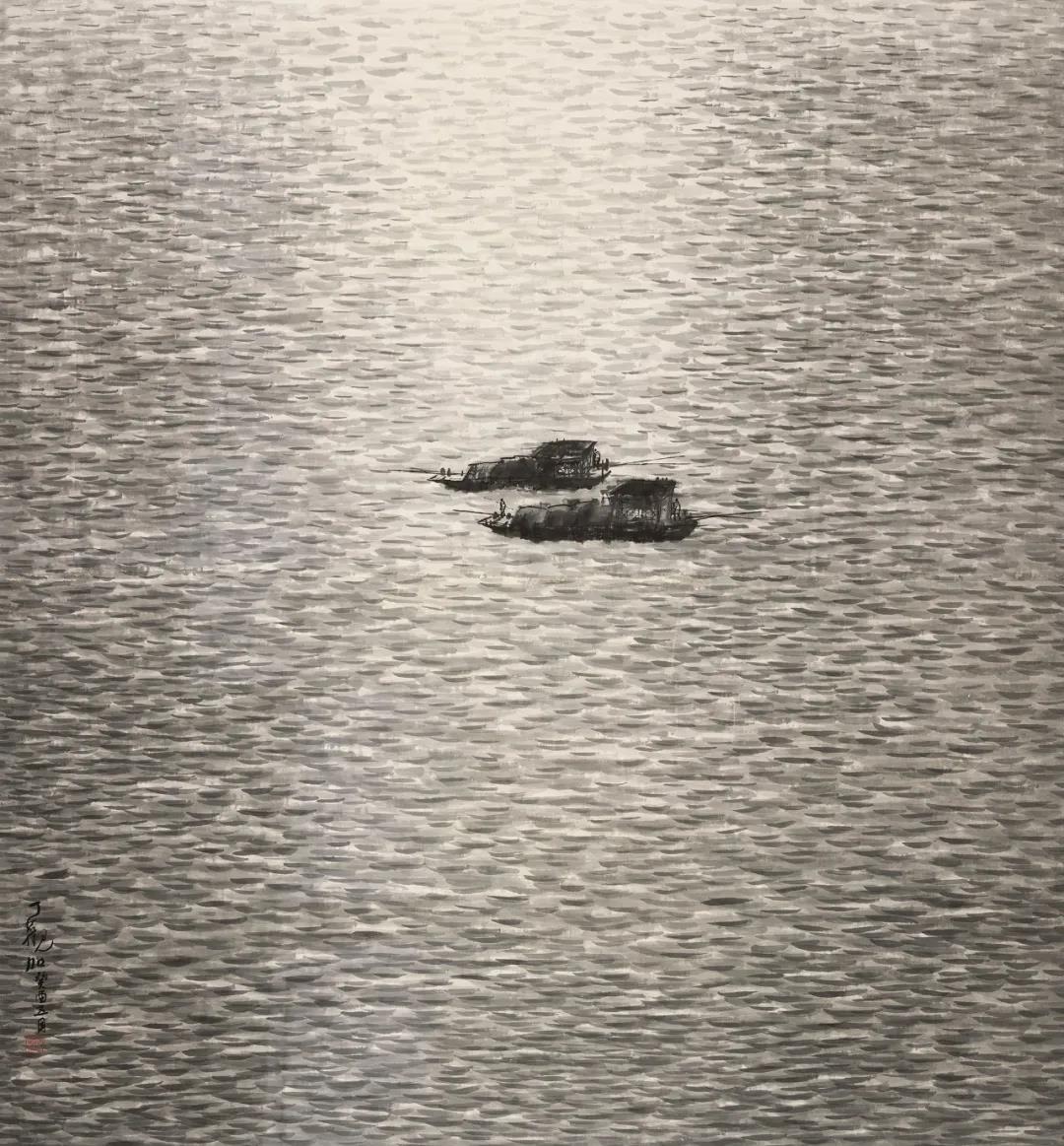 我出生在长江口崇明岛,生活、学习、工作未离开过长江。以后又常在无锡太湖游历,特别是大运河入江北上交汇口、我工作的镇江。我的画室在北固山中峰,开窗便见浩荡江水奔腾东去。所以,水是我最熟悉的题材,渔民的生活一直萦绕着我的脑海。这幅《岁月悠悠》就是我表达对渔民生活的深深情思。