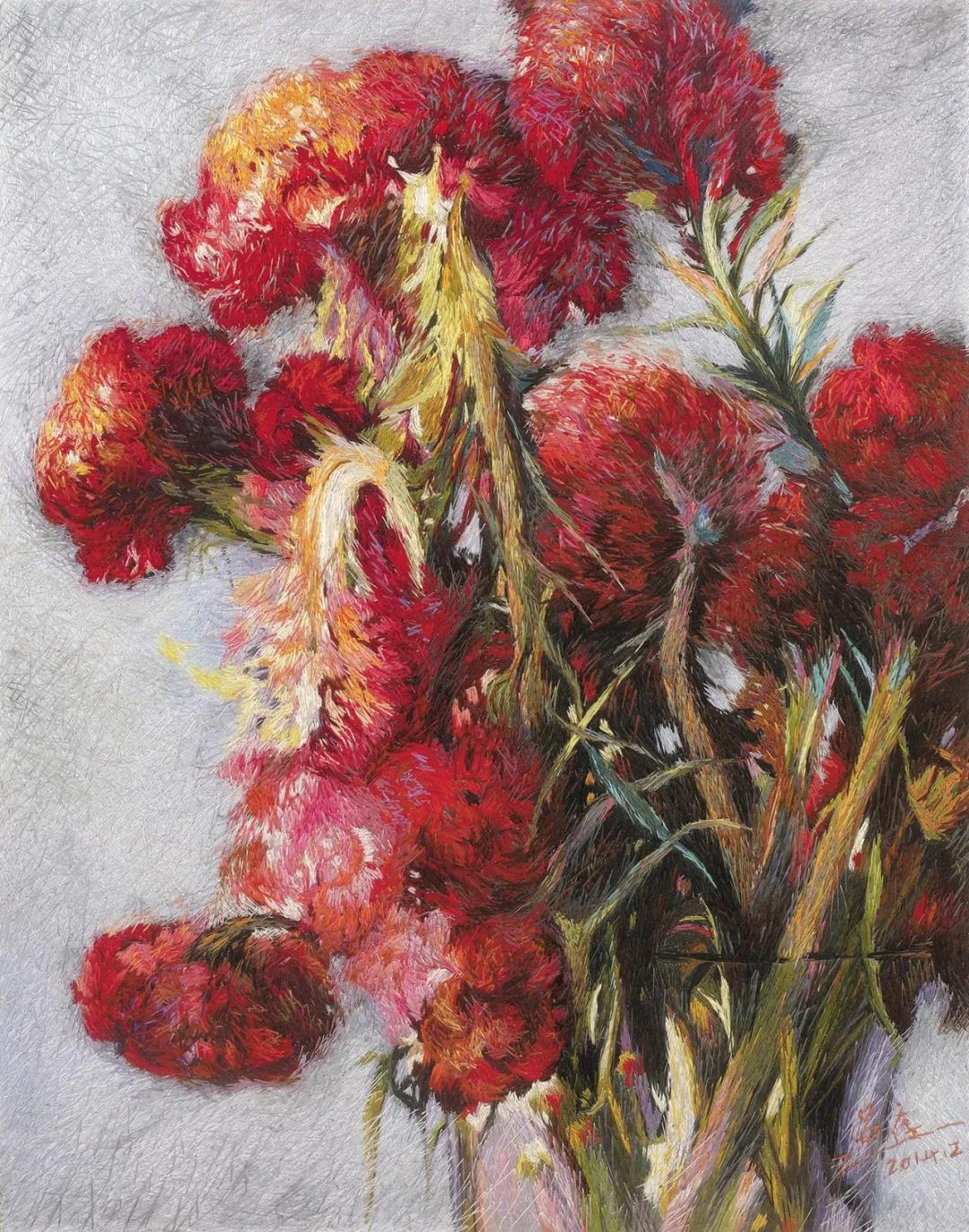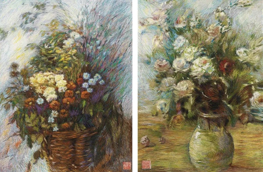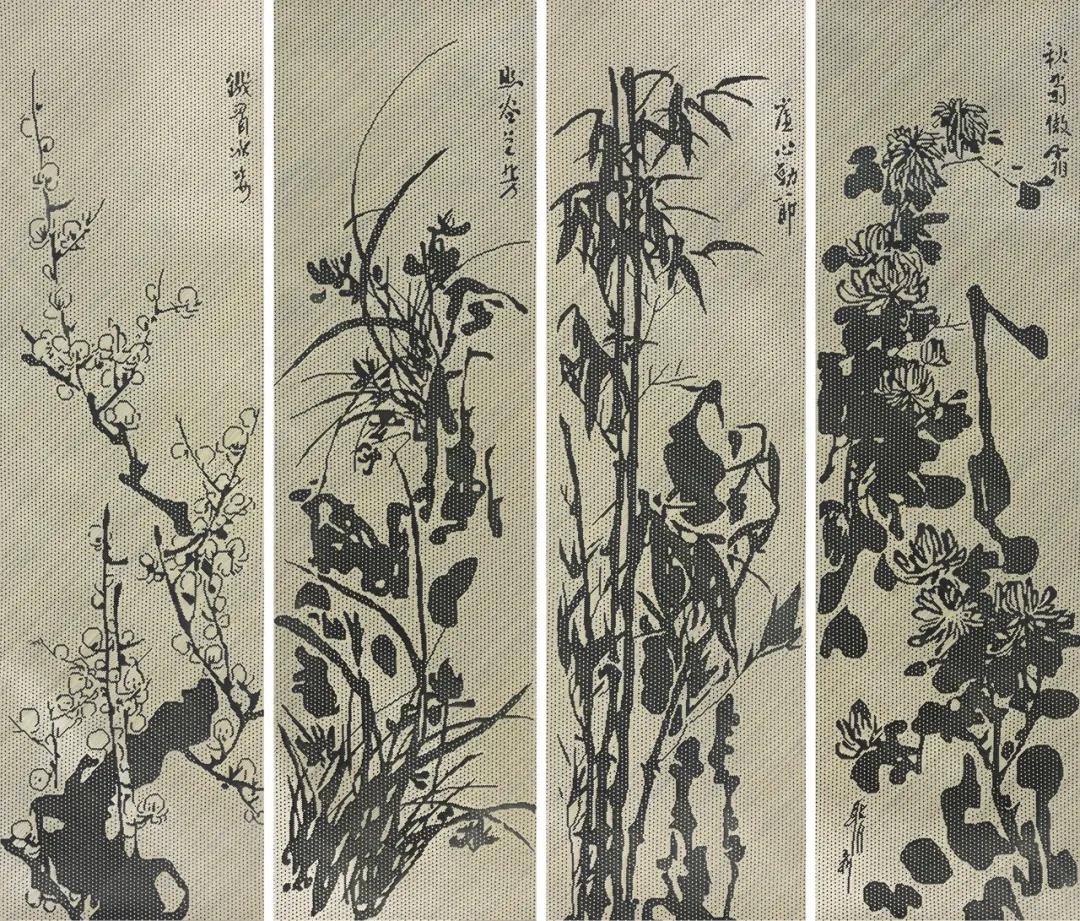 梅兰竹菊指:梅花、兰花、竹、菊花。被人称为“四君子”。品质分别是:傲、幽、坚、淡,同时梅、兰、竹、菊也是中国人感物喻志的象征。这件作品由四幅竖幅组合,在2004 年参加首届中国民间工艺品博览会获得第五届中国民间文艺《山花奖》。