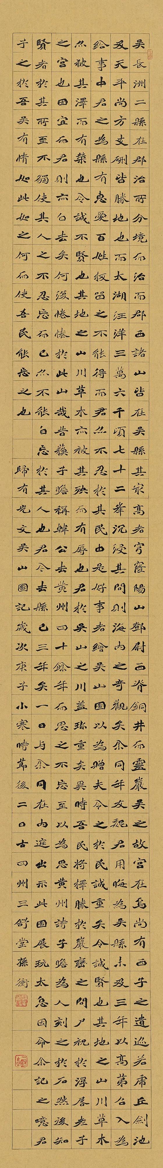 归有光好友魏用晦为吴县县令,有政绩,深得百姓爱戴,调迁时百姓挽留不已,并作《吴山图记》赠他。数年后,魏用晦对吴县百姓仍念念不忘。作者用魏碑书体表现《吴山图记》,如涓涓流水,把通过赠图写百姓对县令的怀念,通过作记叙述县令对百姓的情思表现的淋漓尽致。