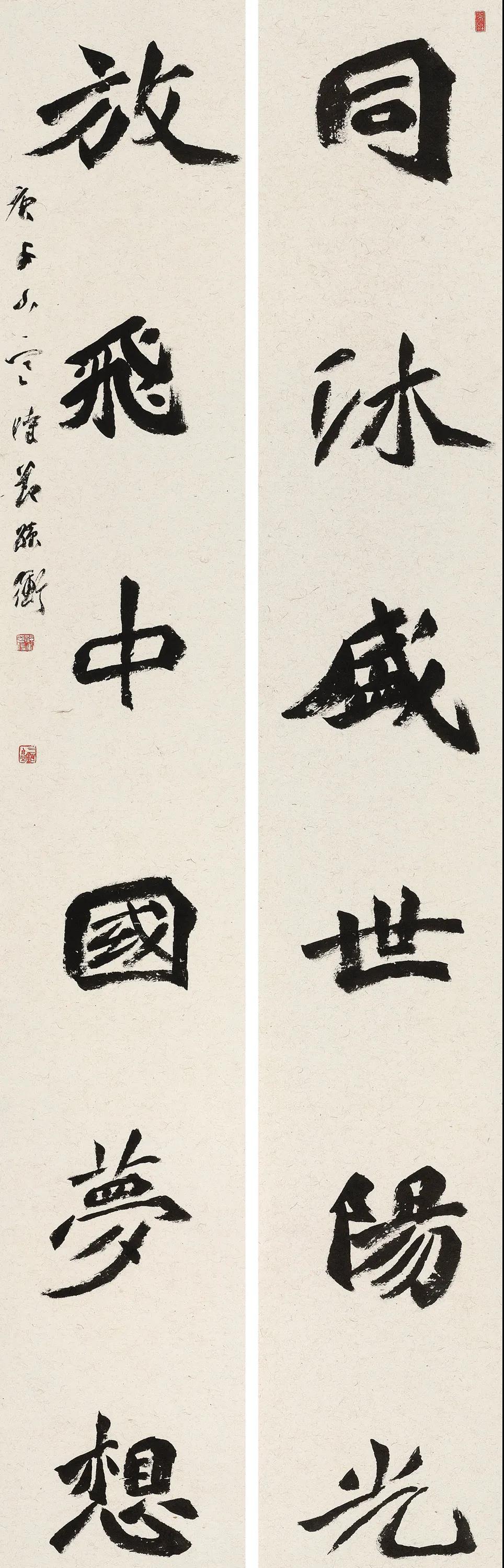 今年是决战决胜脱贫攻坚,全面建成小康社会关键之年。故书写“同沐盛世阳光,放飞中国梦想”,用古朴浑厚的魏碑书体书写这副对联,体现了作者对中国决胜全面建成小康社会的喜悦之情。