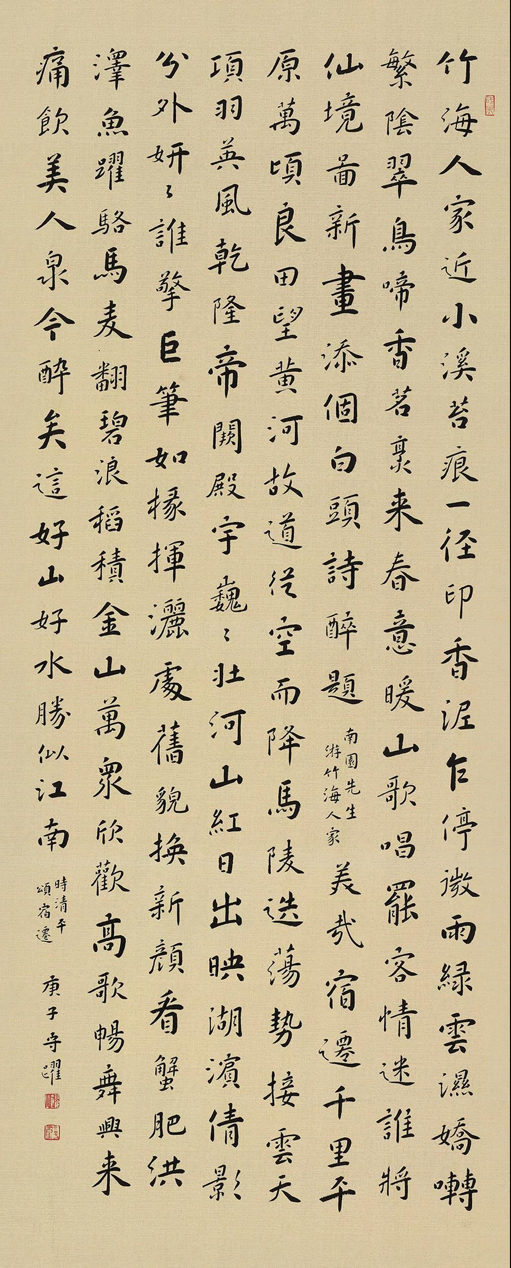 楷书创作忌用笔和结体僵化而失去灵动性,在此件作品书写时尽量让线条厚实而不失灵动,结体宽绰而气韵流畅,用行草书创作的方式来尝试解决楷书创作中单个字的大小单一问题,基本做到了参差变化有度,整体基本统一协调。