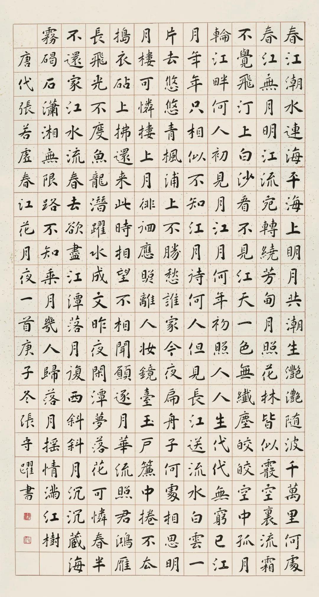 张若虚的《春江花月夜》是名篇,歌咏祖国大好河山,作为新时代的书法工作者必须用手中的画笔为人民书写,歌颂祖国、歌颂人民、歌颂我们这个伟大的时代,用优秀的文艺作品回报人民、回报社会。