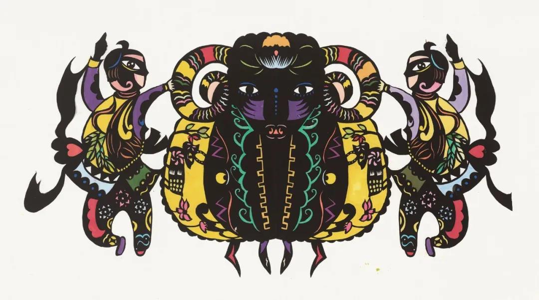 在乡村振兴致富的路上,通过养羊走上了致富的道路,小伙把自己的羊装扮起来,载歌载舞,庆祝丰收。通过剪纸把这喜悦的心情表达出来。