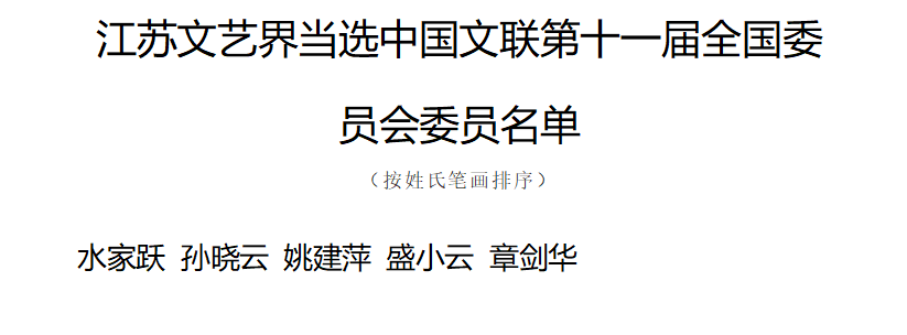 在本次文代会上,我省水家跃、孙晓云、姚建萍、盛小云、章剑华(按姓氏笔画排序)5位同志当选中国文联第十一届全委会委员,盛小云同志当选中国文联第十一届全委会主席团委员,体现了党中央对江苏文艺、文化发展的充分肯定,体现了江苏文艺在我国文艺事业中的重要地位。