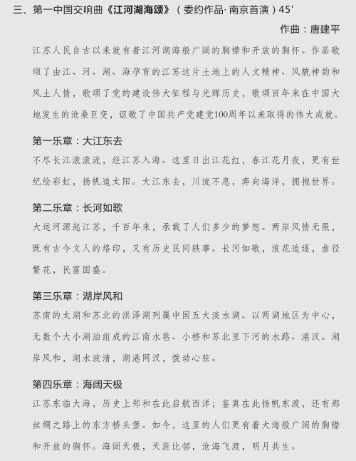 音乐会由时长18分钟的《艰难与辉煌》开场。这部作品以贯穿始终的《国际歌》素材赋予音乐强烈的英雄主义气质,在旋律中表现了中国共产党百年奋斗的艰辛历程、讴歌革命胜利的喜悦和新时代建设的辉煌成就。时长25分钟的《琴动山河》以传统、现代、民族、流行元素交融的中西合璧艺术形式描绘了长城、长江、黄河、江苏、江南的沧桑与巨变,盛赞祖国美好山河、歌咏百姓幸福生活。最后时刻,作为音乐会点题之作《江河湖海颂》,曲长45分钟,以江苏特有的江河湖海格局为创作灵感、以江苏土地上生存的人民为歌咏对象,在“大江东去”“长河如歌”“湖岸风和”“海阔天极”四个乐章呈现了浩浩荡荡的长江、千年绵延的大运河、星罗棋布的湖泊以及浩瀚无边的大海等意象,为观众展开了一幅厚重的江苏人文画卷。