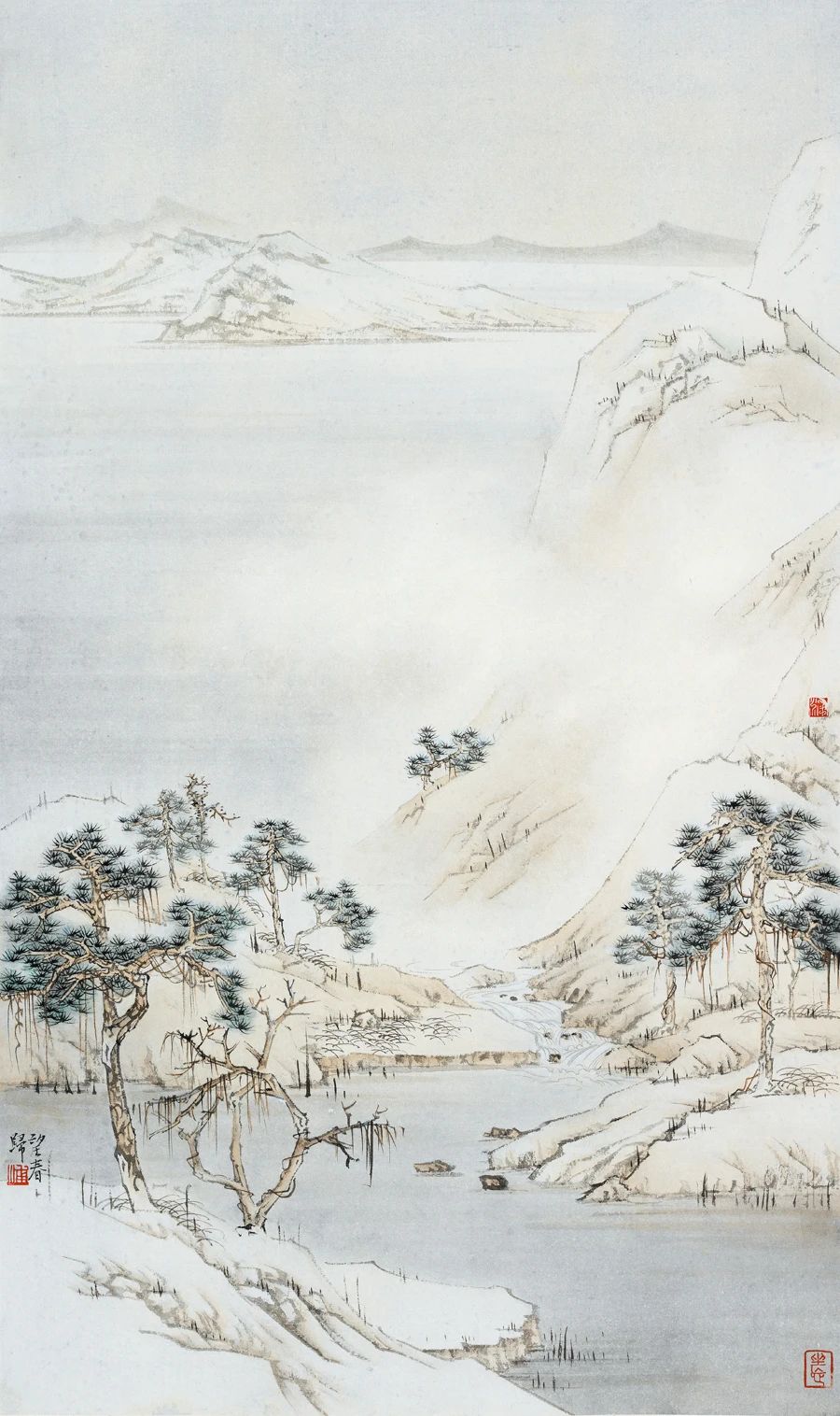 王石谷看重青绿山水,认为重点在于“体要严重,气要轻清,得力全在渲晕”。浦均习画多年,着色偏于冲淡宛转。唯早期画面富有抒情与装饰意味,冷暖色调偏重,但处理转圜完整,可见于2009年的《寒声碎》等画作。满纸绯色天空,映衬得蔼蔼丘陵,微泛蓝光,绿水沉沉,寒鸭打破静寂。此时期颇具古风,单纯坦诚的画风初现端倪。其后至2013年起,画风渐定,诗意颜色湛然纸面,敷色浅淡。无论素月分辉,孤光照影,还是绿水行舟,万壑争流,都只教山川高阔,气象烟岚,天地间清清郎朗,意气悠悠,显见得画家渐入佳境。于气定神闲中,画手移风而雅而颂,中庸法度纯然在胸。便是些抒情小品:冬夜寒、望春归,也使浓淡相宜,萧散舒缓,不见丝毫困顿自矜之情。冷暖色调的处理一如既往,犹见心思:哪怕朱红粉绿相映,绿衣覆山、黄云横陈,也未见丝毫冲突,因在渲染中降低了色度明度,犹如古琴之音,淡淡然而能长久,盖诸声色能以静定得之。