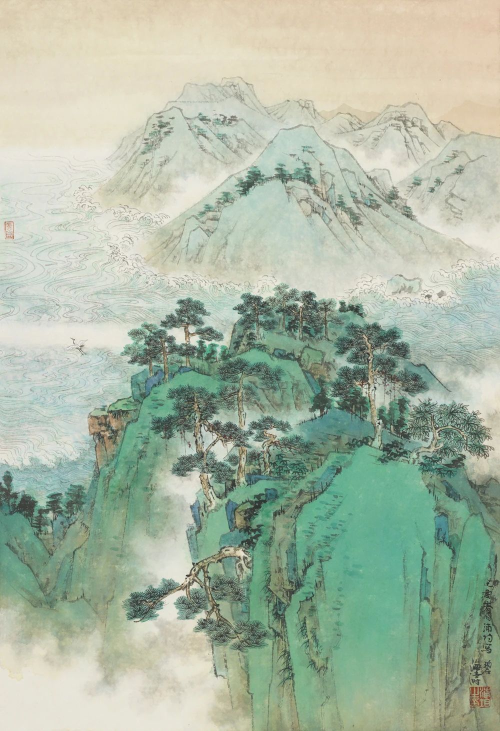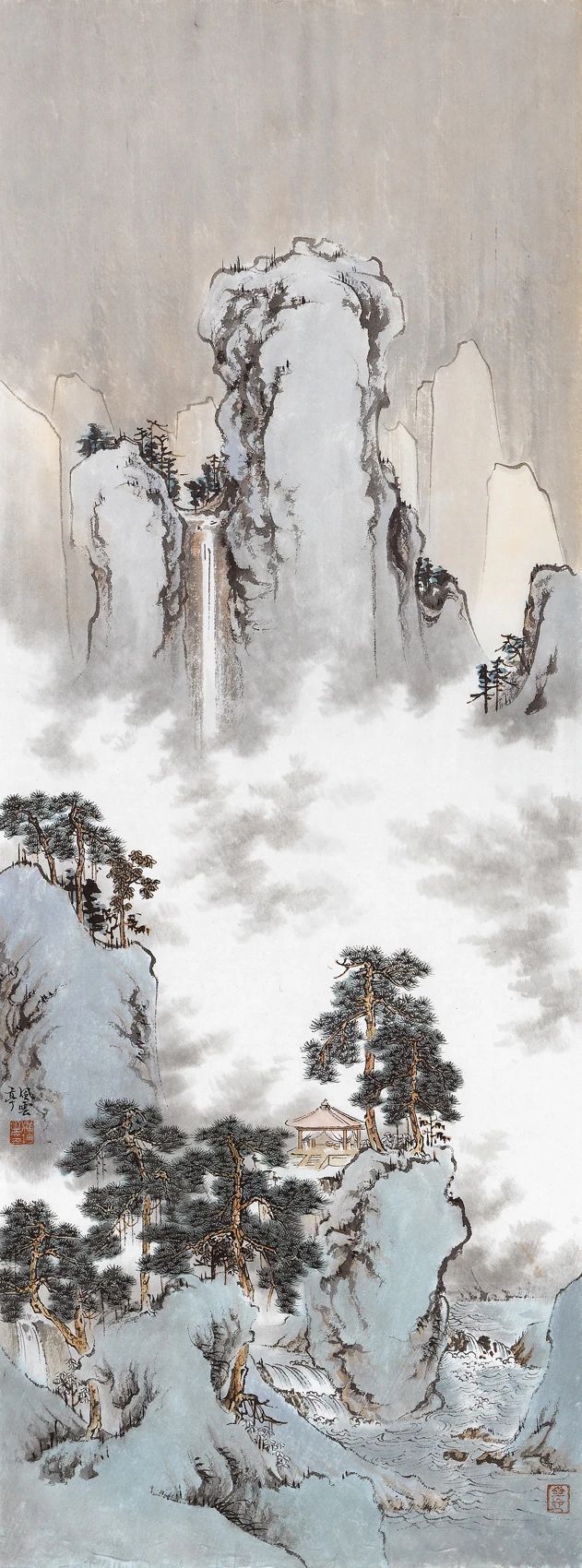 浦均对于敷色理念一直如此,但在笔法方面,却始终在尝试。早期山形程式化,笔力光滑平顺,其后注重皴法与笔力,疏密深远,情与景偕。又加入诸多内容,如山川之间,有云雾纵横,水云聚散。亦讲求结构的开阖,由平远至深远、高远。