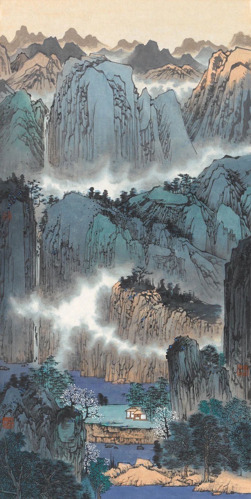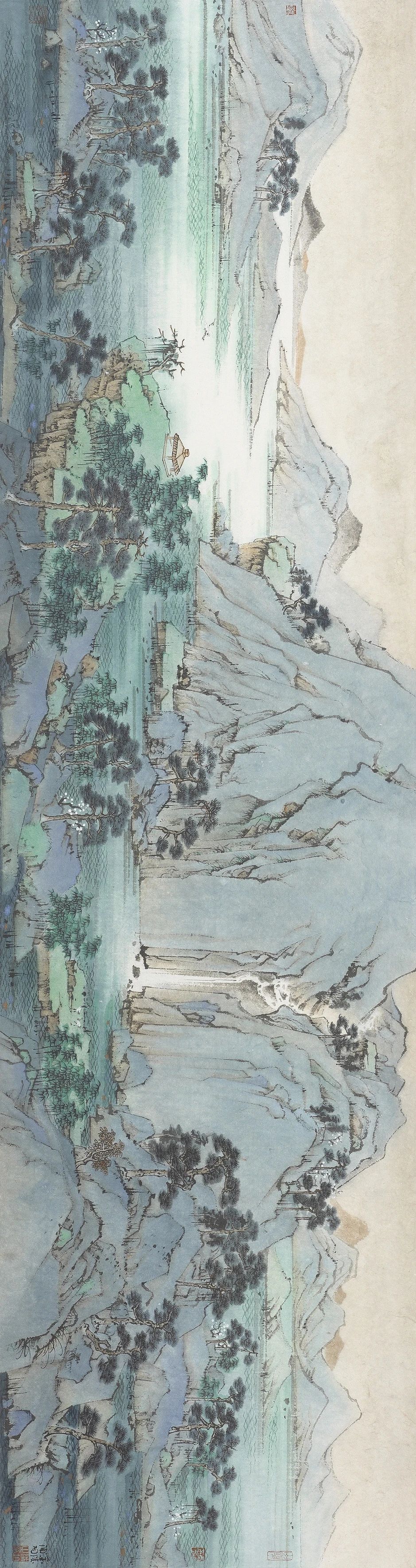 青绿山水偏工,自李思训、王希孟、赵伯驹以来,喜爱者颇多,有时难免会陷入优美的窠臼,人云得其工难得其雅,似与文人所崇尚的雄伟、士气观念相左。若能在工与意之间寻得平衡,闲话诗意,造境阆苑,亦不失为妙写春秋。浦均于诸多手法中,独睐朴质温润的色调,简单清旷的笔法,自有其思量。