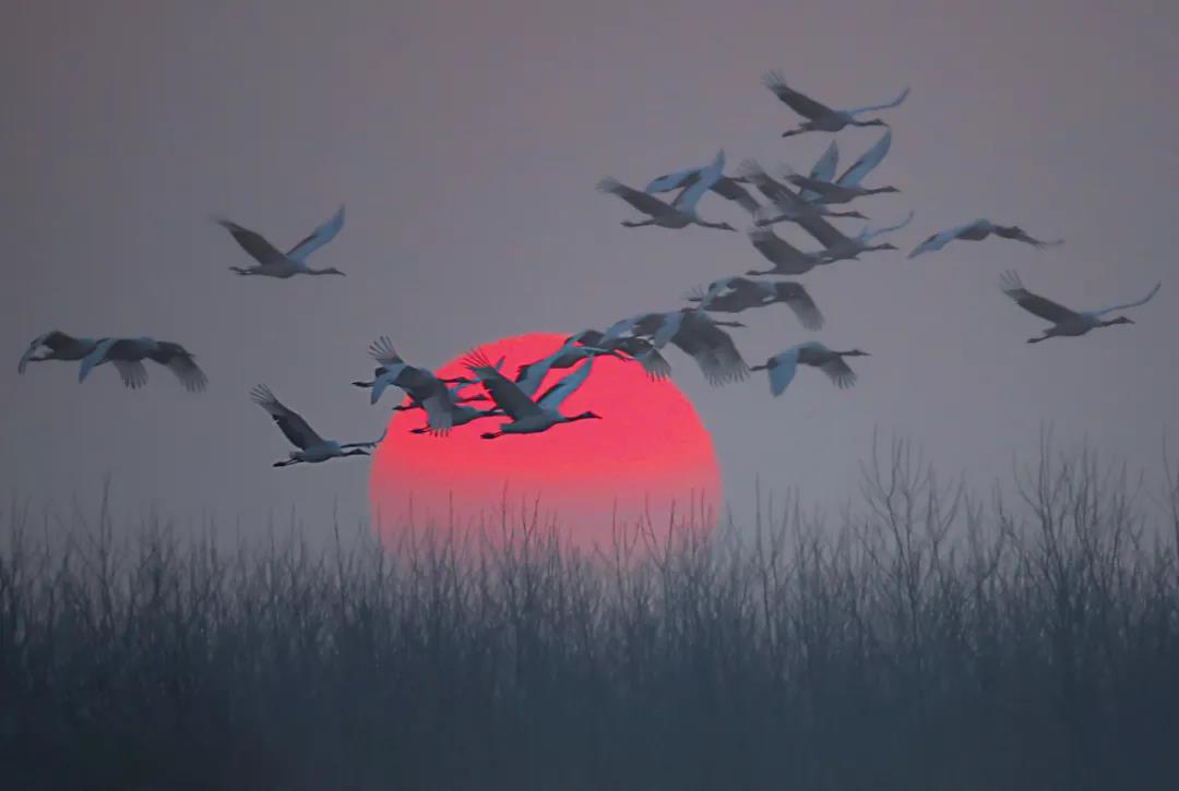 “美好江苏”摄影专题之一《旭日东升》,丹顶鹤是国际一级重点保护动物。丹顶鹤又经常被称之为仙鹤,是世界上珍贵的鸟类,全世界共有15种鹤,我国共有9种,占一半以上。丹顶鹤是吉祥的象征,自古以来就有松鹤延年的说法。诸鹤之中,以体形秀丽来隐喻长寿之意。