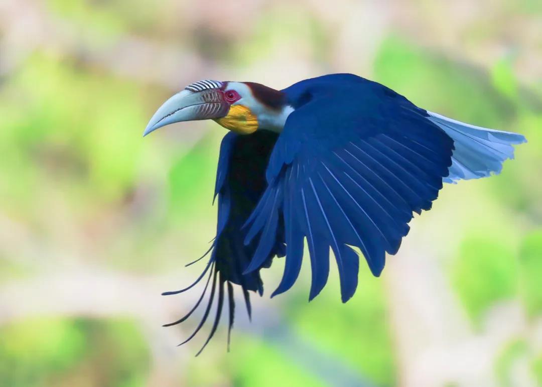 犀鸟,被列为国家二级保护动物。因嘴呈象牙色,外形又像犀的角,故称为犀鸟。背面羽毛纯黑,具有绿色金属光泽。翼缘、飞羽和尾羽先端白色。雄鸟嘴长、大而下弯,故轻坚而灵巧。常栖息于干燥森林中的巨木上,以果实、昆虫为食。