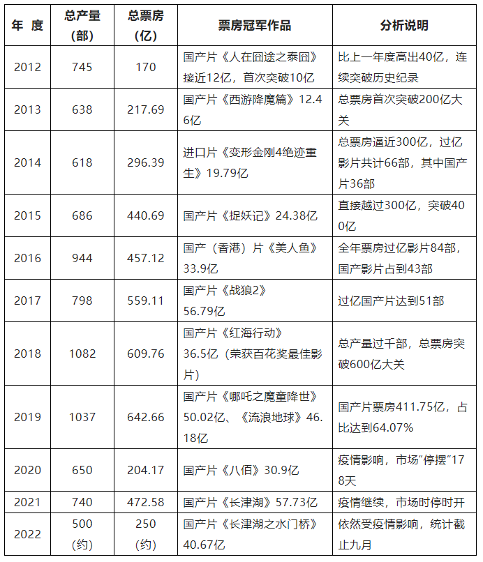 2012年到2022年,这十年的中国电影,产量与质量,市场与票房,均取得可喜的成就,尤其是市场发展,呈现出高速迅猛之态。我们可以从媒体报道以及官方网站的统计数据中,回顾对比一下其发展轨迹: