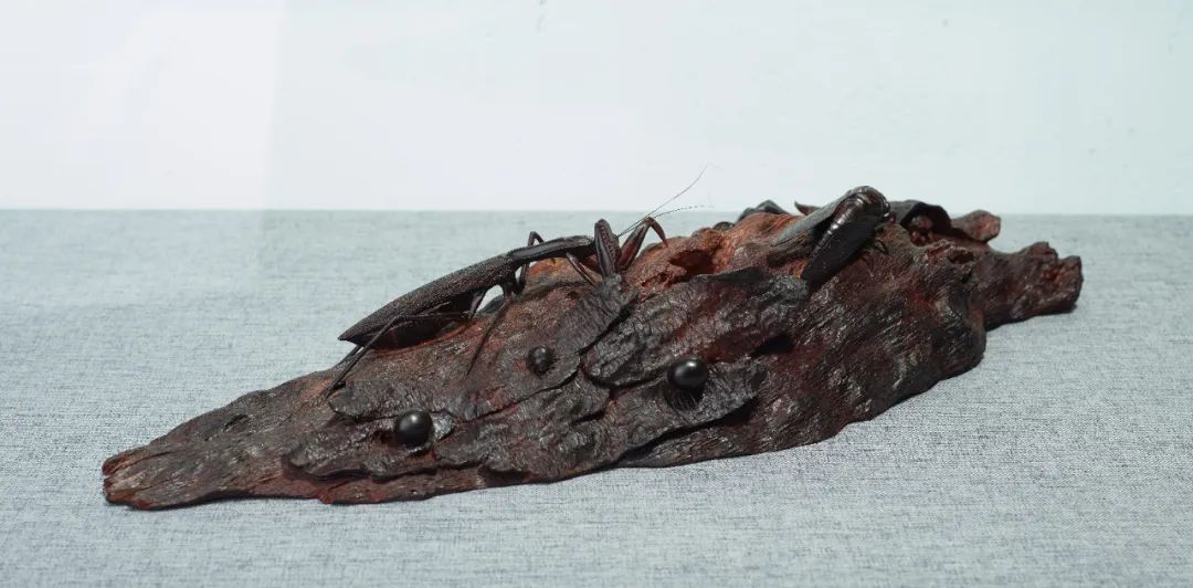 木雕《夏趣掠影—螳螂捕蝉》 林龙震、张大海、林伟 长45、宽15、高8(cm)