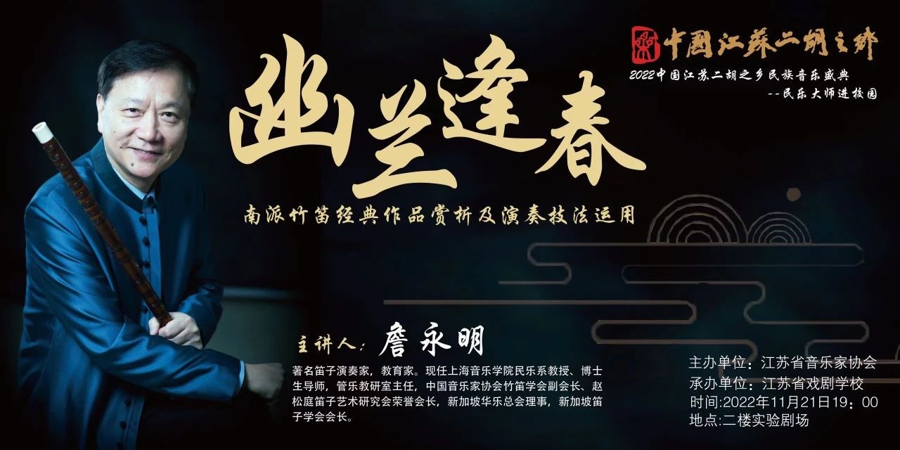 11月21日晚,上海音乐学院詹永明教授走进江苏省戏剧学校,为学校师生作《幽兰逢春—南派竹笛经典作品赏析及演奏技法运用》主题讲座。此次讲座是2022中国江苏二胡之乡民族音乐盛典— “民乐大师进校园”系列活动之一。
