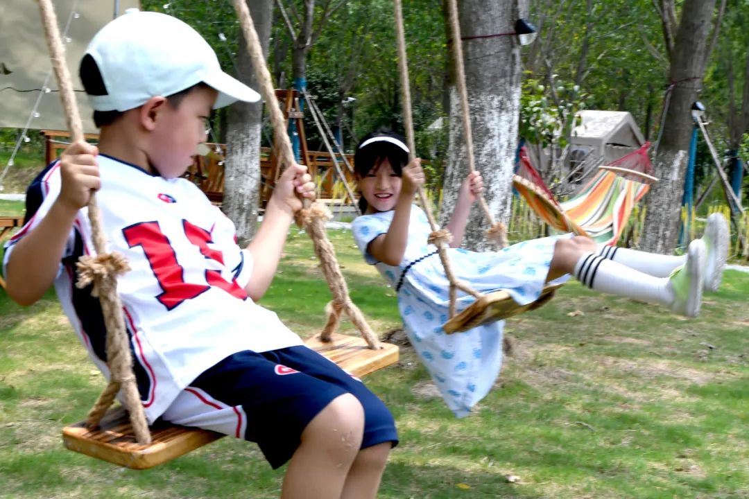 孩子们在启东市惠萍镇东兴镇村的户外宿营网红打卡地荡秋千。
