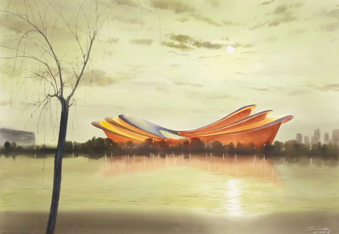 沙金华 蝶湖月光(启东大剧院) 水彩 80cm×114cm 南通