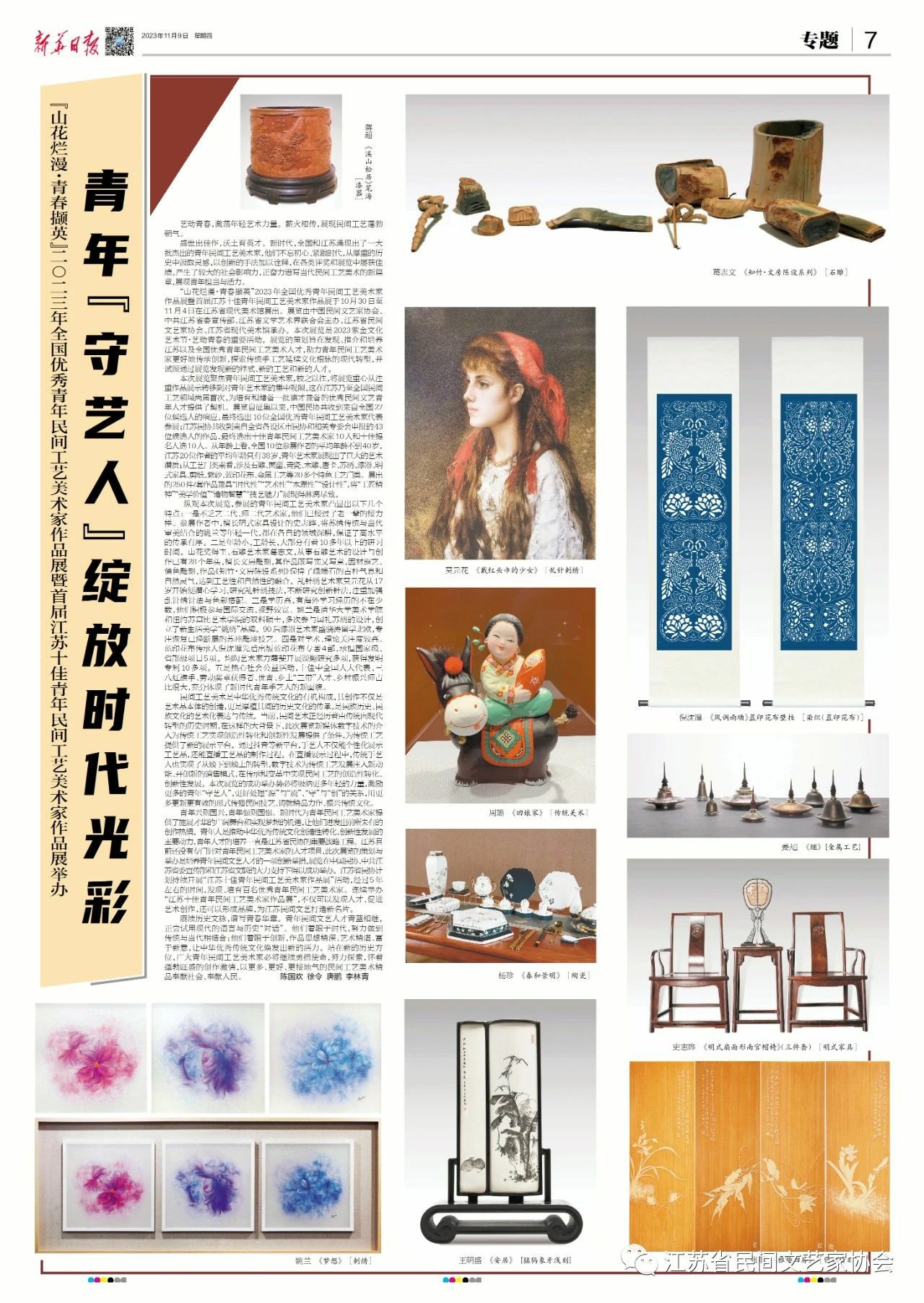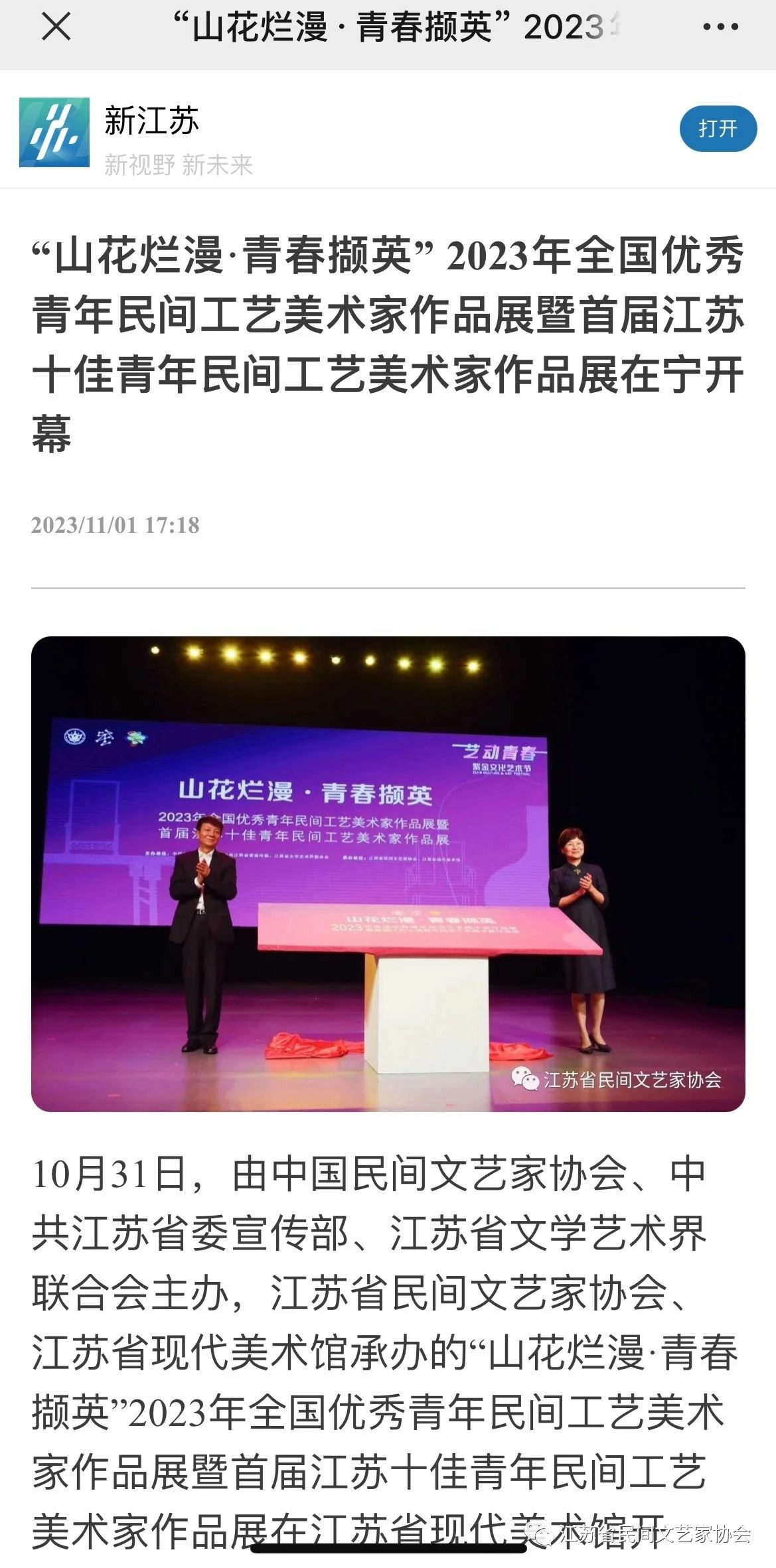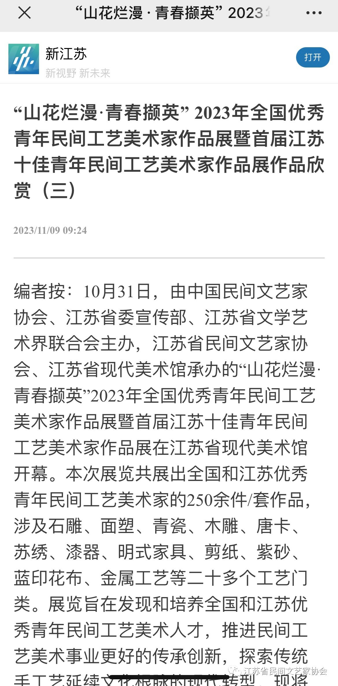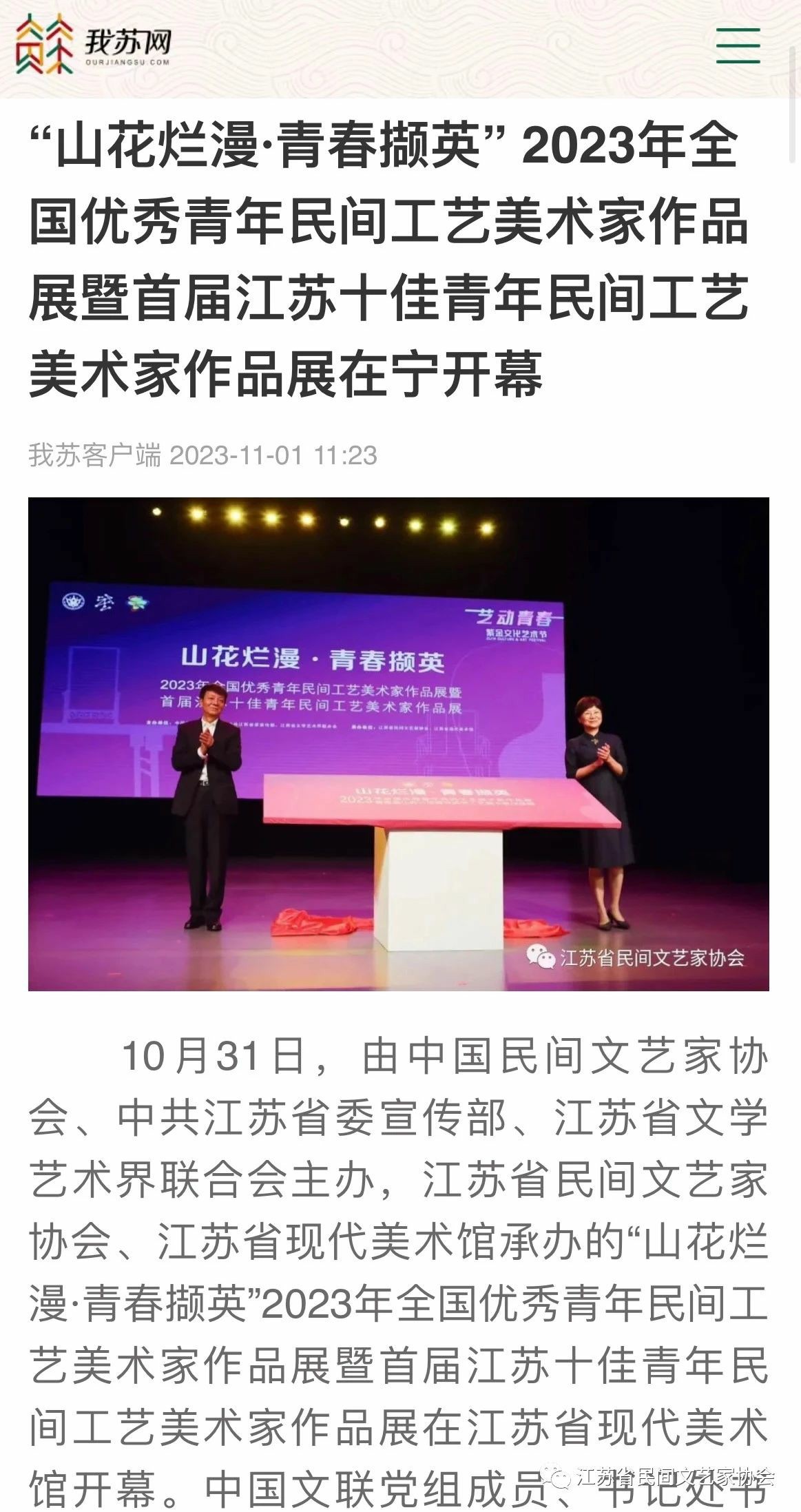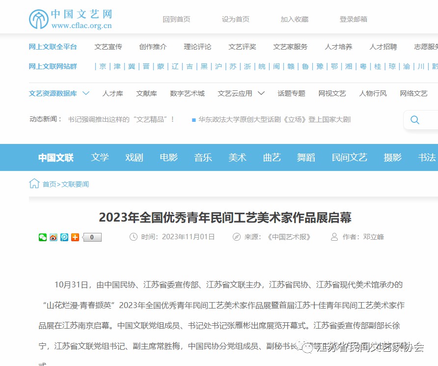 “山花烂漫·青春撷英”2023年全国优秀青年民间工艺美术家作品展暨首届江苏十佳青年民间工艺美术家作品展在江苏省现代美术馆开幕。媒体广泛关注!争相报道!
