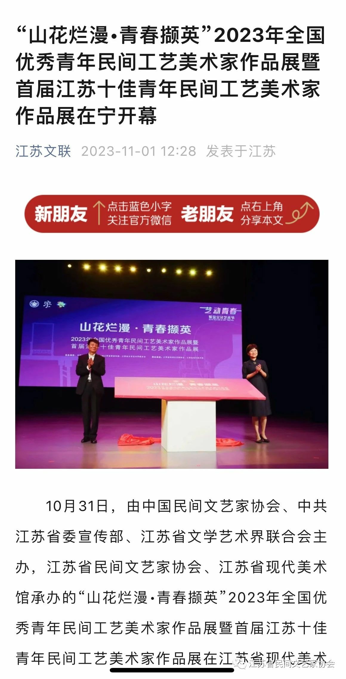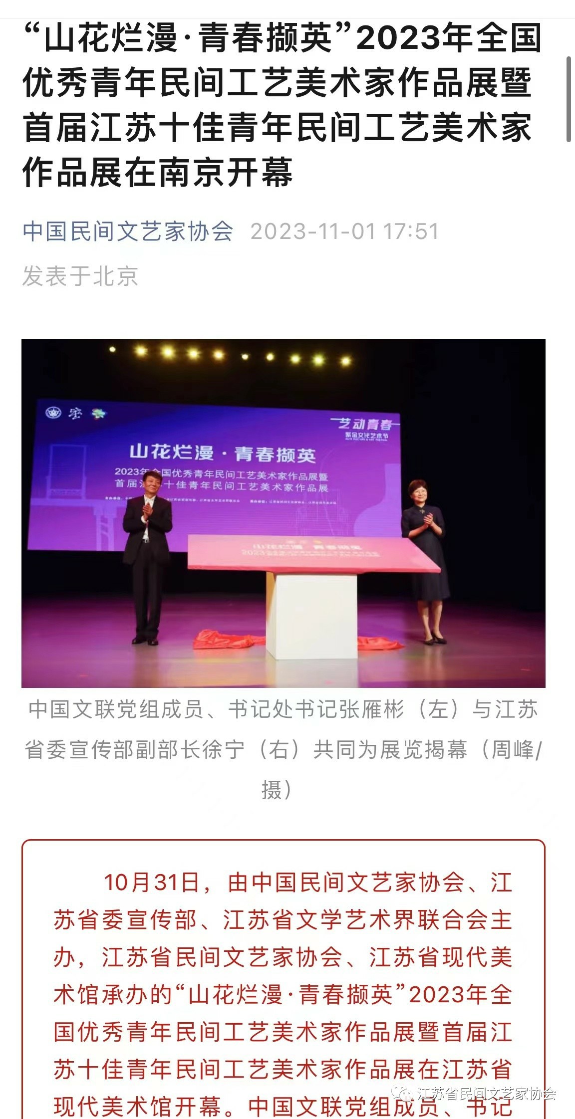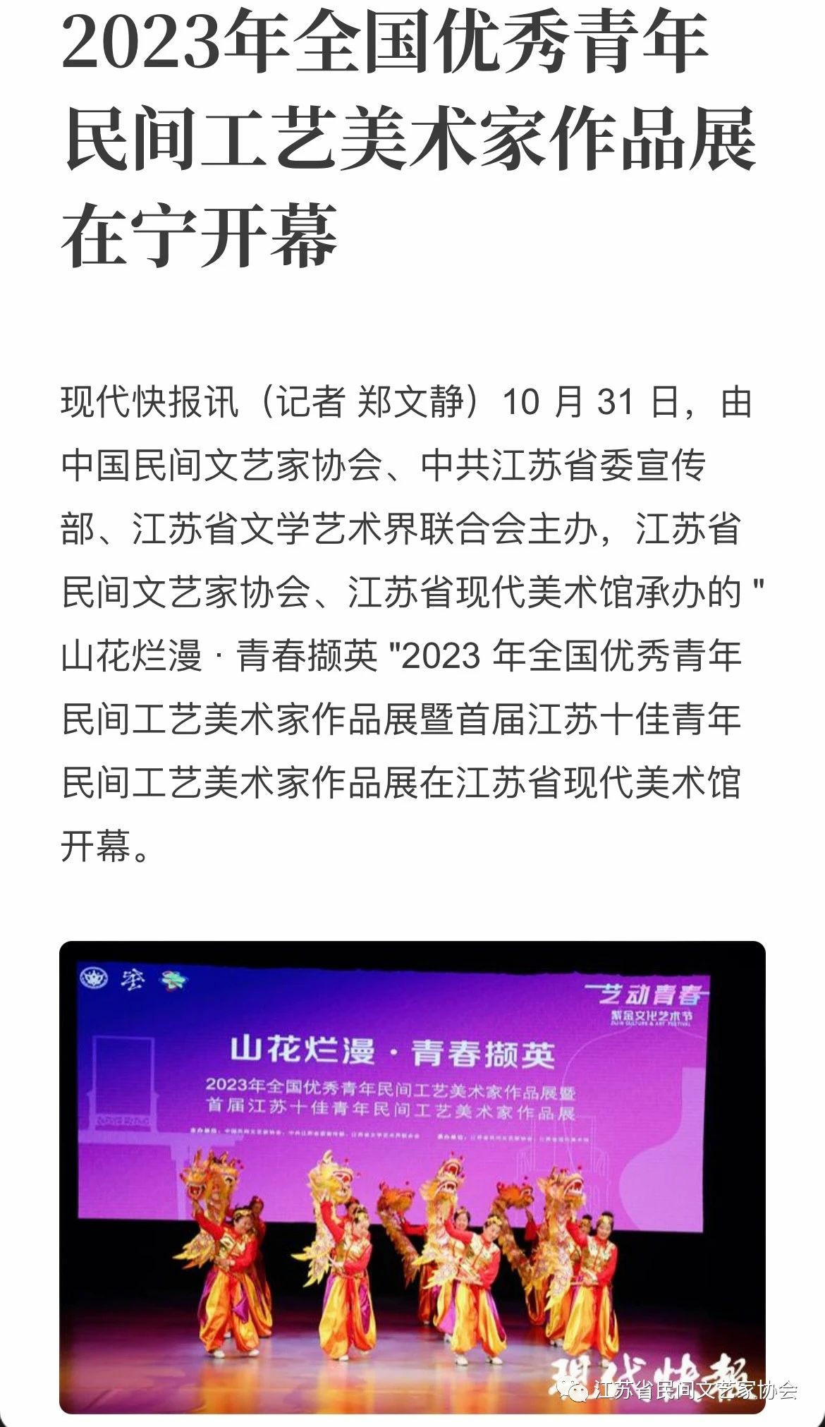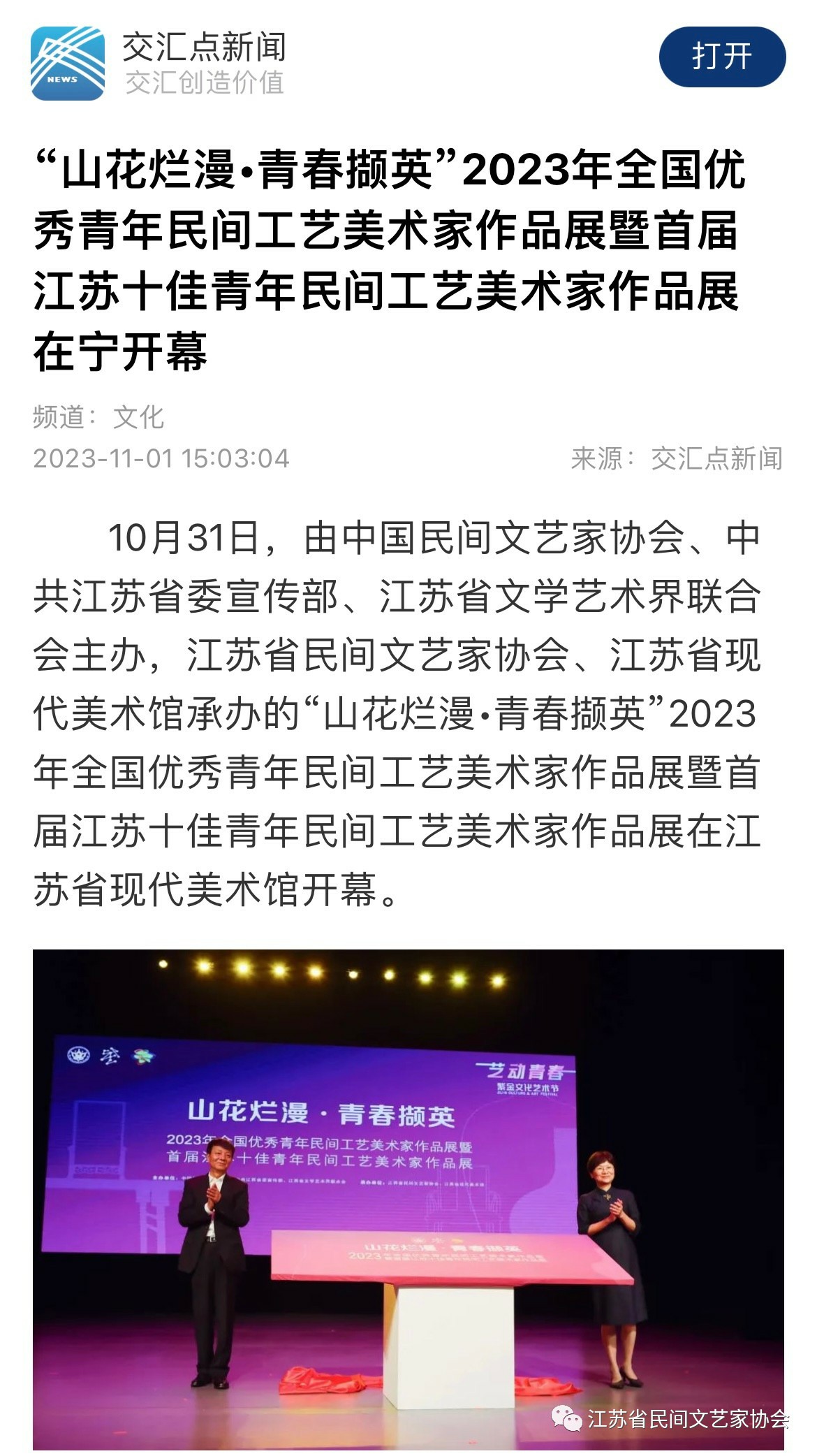 “山花烂漫·青春撷英”2023年全国优秀青年民间工艺美术家作品展暨首届江苏十佳青年民间工艺美术家作品展在江苏省现代美术馆开幕。媒体广泛关注!争相报道!