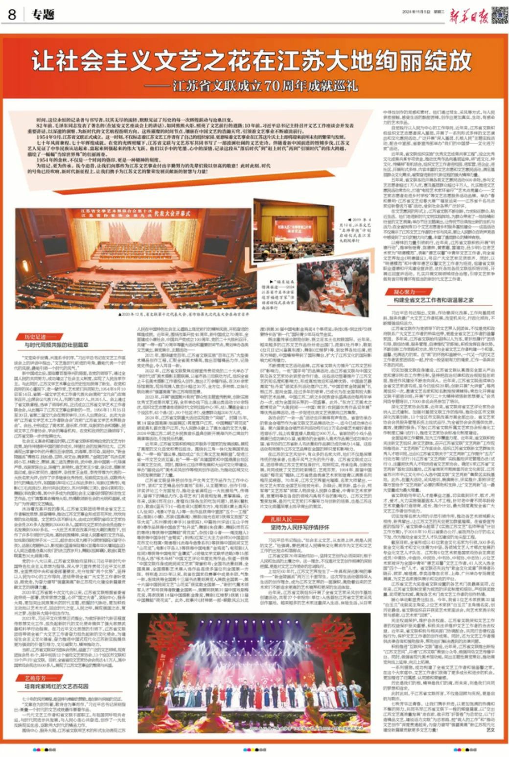 《中国艺术报》《新华日报》《江南时报》《繁荣》周讯等纸媒平台刊发《江苏省文联成立70周年成就巡礼》报纸专版,通过“历史足迹——与时代同频共振的壮丽篇章”“艺苑芬芳——培育姹紫嫣红的文艺百花园”“扎根人民——坚持为人民抒写抒情抒怀”“凝心聚力——构建全省文艺工作者和谐温馨之家”四个板块内容回顾江苏省文联70年来取得的成就,深度的报道通过报纸这种传统媒体在群众中产生了深远影响。