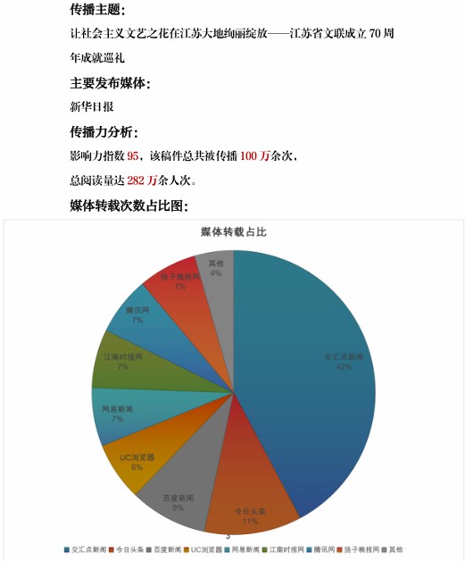 纪念江苏省文联成立70周年座谈会在南京隆重举行。《中国艺术报》、《新华日报》、“学习强国”、新华网、荔枝新闻、《南京晨报》、《现代快报》、《江南时报》、我苏网、江苏文艺网、江苏文联公众号等平台均对此进行了报道。《江苏省文联成立70周年成就巡礼》及《纪念江苏省文联成立70周年座谈会在宁举行》两篇报道在新华网客户端的阅读量突破120.2万和77.6万,荔枝新闻客户端相关阅读量分别为28.9万和27.2万,我苏网的阅读量分别为6.8万和8.9万,且仍呈上升趋势。值得一提的是,《江苏省文联成立70周年成就巡礼》在《新华日报》的阅读量高达282万余人次,稿件总共被传播100万余次,影响力渠道覆盖网站、APP客户端、微博、电子报、微信、自媒体平台等,影响力指数达95。迅速及时的报道形成了覆盖面广、辐射力强、影响力深的宣传效应,多角度、多方位对外展示了江苏文艺和江苏省文联取得的成就。
