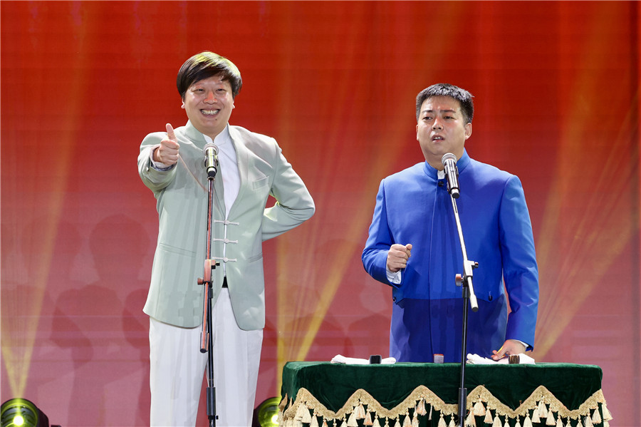 青年相声演员董建春、盛伟紧接其后登台,表演了相声《拍广告》,博得全场观众的笑声和掌声。作为相声门类年轻一辈的佼佼者,他们曾登上2024年央视春晚舞台,火爆荧屏,一句“我瞎说啊”更是成为热梗。