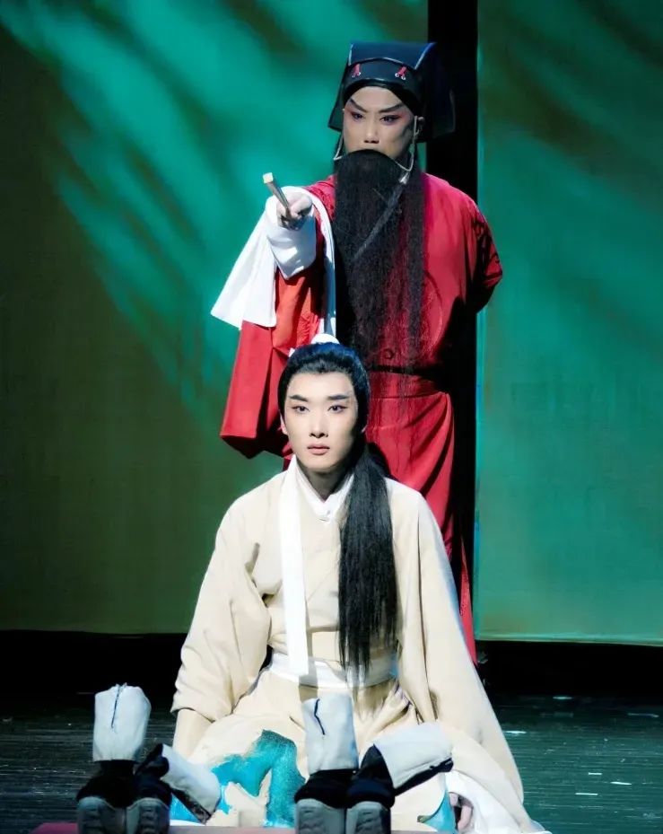 演员的形体身段更是取道水墨,气韵生动。饰演宋徽宗和王希孟的演员李政成和游佳琦在现实中也是一对师徒,两人扎实的武戏功底为形体表达带去了更多可能。《奇遇》一折中,宋徽宗测试王希孟的绘画根底,让他以指蘸酒,现场作画,后又以身垂范。两人在舞台上以身体为道具和支点,王希孟姿态翩翩,揉按提涂,画平远山水,宋徽宗举重若轻,弹抹钩点,画飞天白鹤。两人的身段动作像水墨线条一样流动舒展,身体的展臂凌空一如画笔的提按顿挫,手指的轻拢慢捻一如墨迹的浓淡点染。舞台上的人在作画,作画的人本身也已成为观众眼中的一副画。