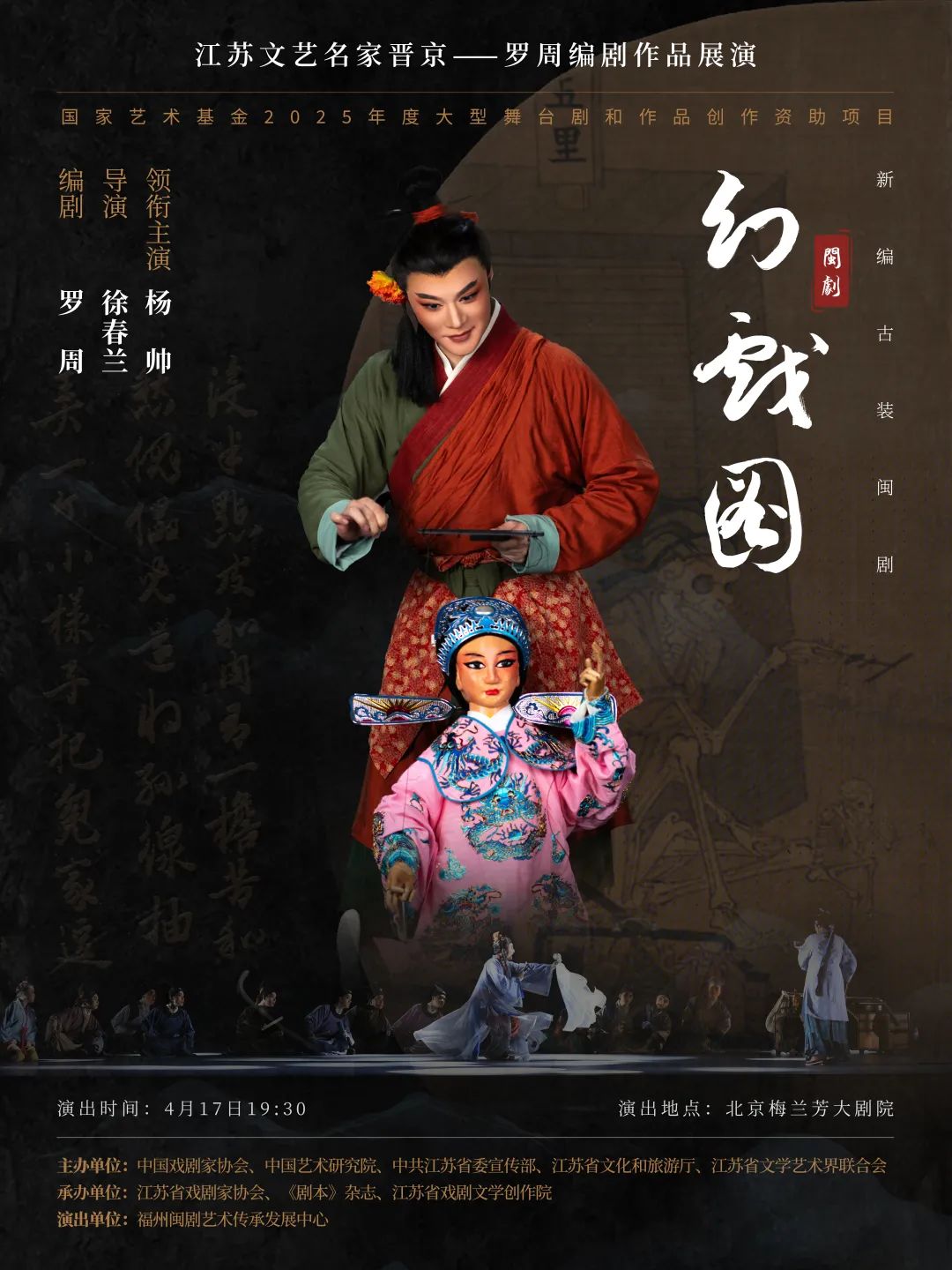 由中国戏剧家协会、中国艺术研究院、中共江苏省委宣传部、江苏省文化和旅游厅、江苏省文学艺术界联合会主办,江苏省戏剧家协会、《剧本》杂志、江苏省戏剧文学创作院承办的江苏文艺名家晋京——罗周编剧作品展演系列活动将于4月13日至21日在北京举办。本次展演将通过六大剧目展演,进行跨越时空的戏剧对话,闽剧《幻戏图》将于4月17日在梅兰芳大剧院上演。
