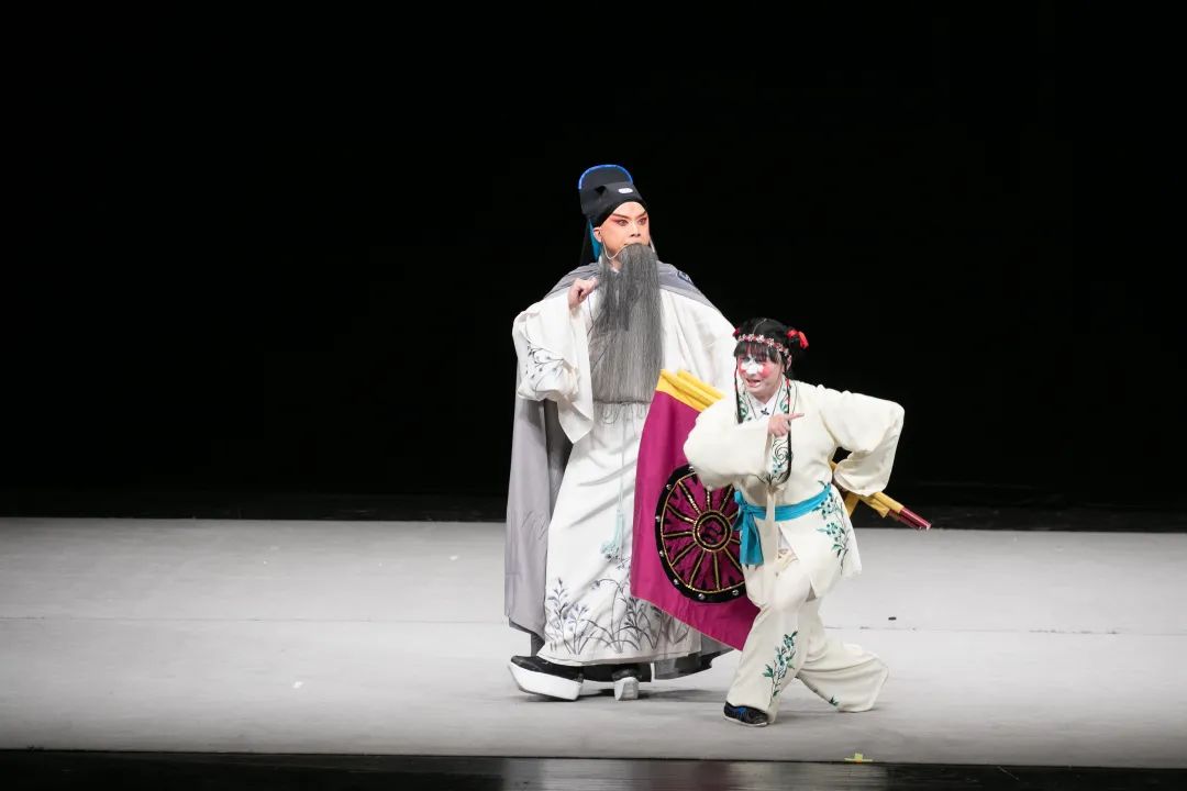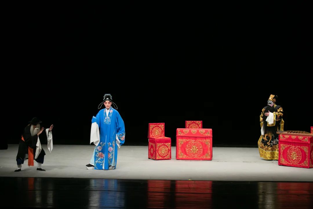 演出在黑色底幕与一桌两椅的简洁布置下开场,昆腔一板一眼,锣鼓丝弦起落间,谢安、郗超、桓温、褚蒜子等历史人物仿佛 “穿越” 而来,演绎着淝水之战背后的精彩故事。首折《候门》,通过奸臣郗超与 “铁憨憨” 桓温密谋篡国的情节,搭配丑角长生的插科打诨,巧妙地勾勒出包括未出场的谢安等人物的鲜明个性。《举将》则围绕舞台上太后褚蒜子、谢安、郗超三人的三角关系展开,在苻坚大兵压境、国家危亡的关键时刻,借助一段开药方、两封《举将书》,展现了郗超 “外举不避仇” 的豁达与谢安 “内举不避亲” 的默契,构建起人物间既对立又共生的戏剧张力,为历史记载增添了可感的情感厚度。