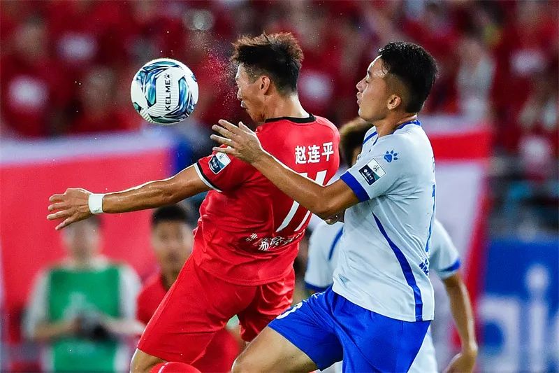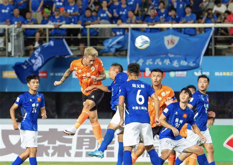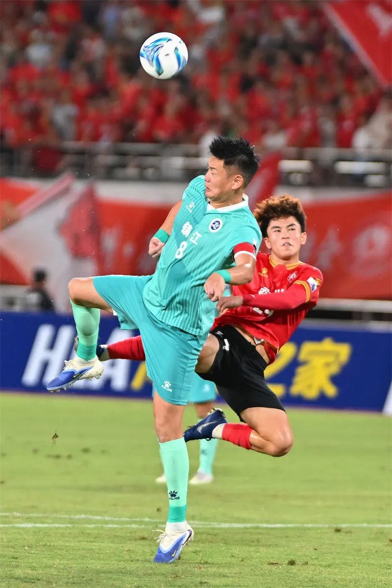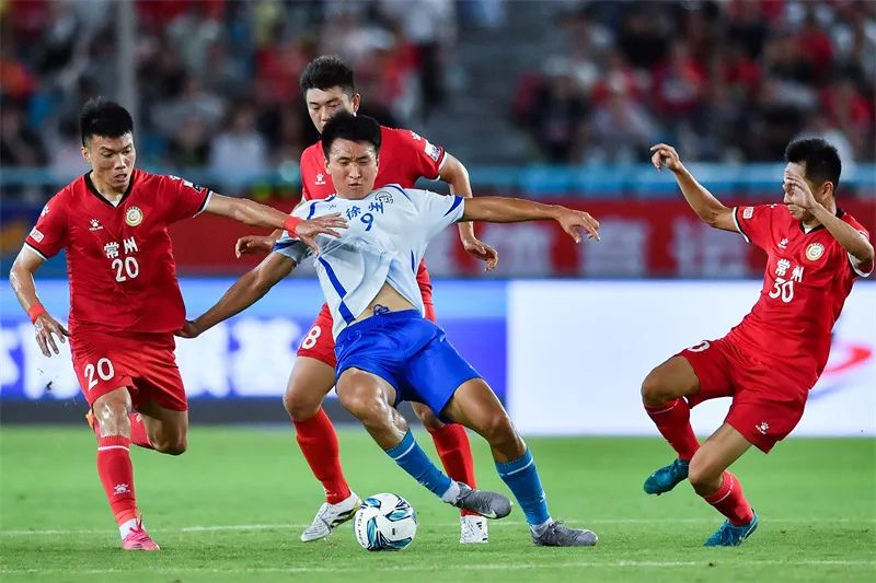 7月20日晚,“苏超”第七轮,常州队主场迎战徐州队。常州队25号球员夏宝龙奋力抢球。沈宇翔 摄