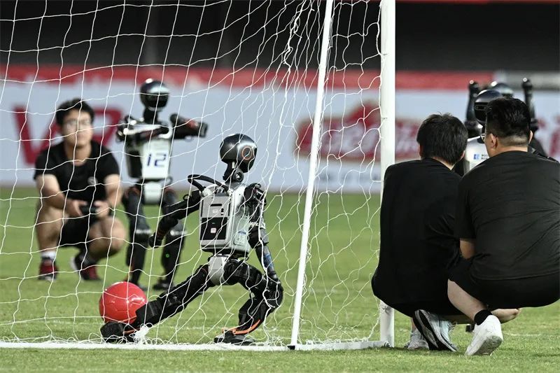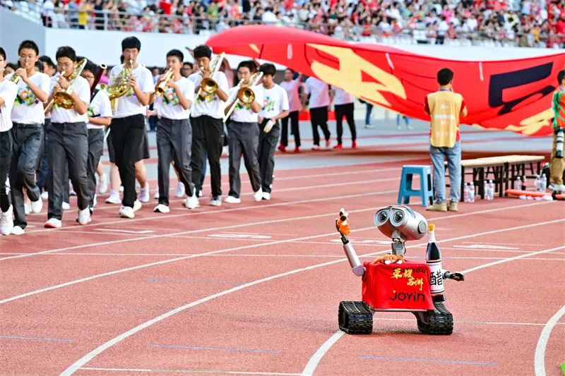 7月20日晚,苏州市体育中心体育场,“苏超”第七轮 ,机器人和现场球迷打招呼。袁新宇 摄