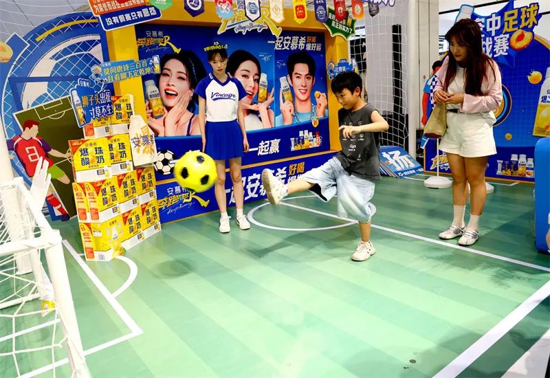 7月20日,扬州一家大型商超里的“绿茵球场”热闹非凡,大人、孩子都来体验临门一脚的快乐。 沈扬生 摄