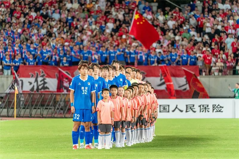 7月20日晚,”苏超”第七轮无锡队VS淮安队的比赛在江阴市体育中心体育场正式打响,比赛前两队球员和小球员列队举行升国旗仪式。曹俊 摄