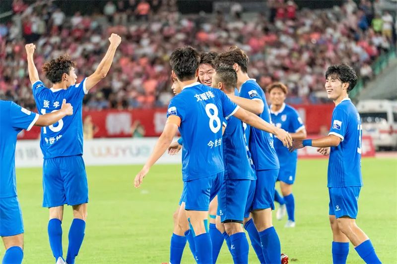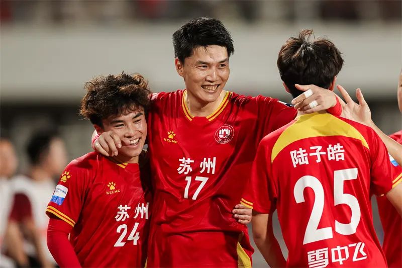 苏州队王飞(左二)取得首粒进球后和队友庆祝。蒋文超 摄