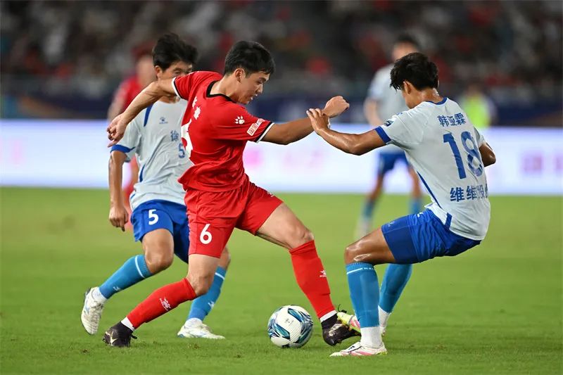 7月20日,在“苏超”赛场无锡队对阵淮安队的比赛中,双方运动员激烈拼抢。郎从柳 摄